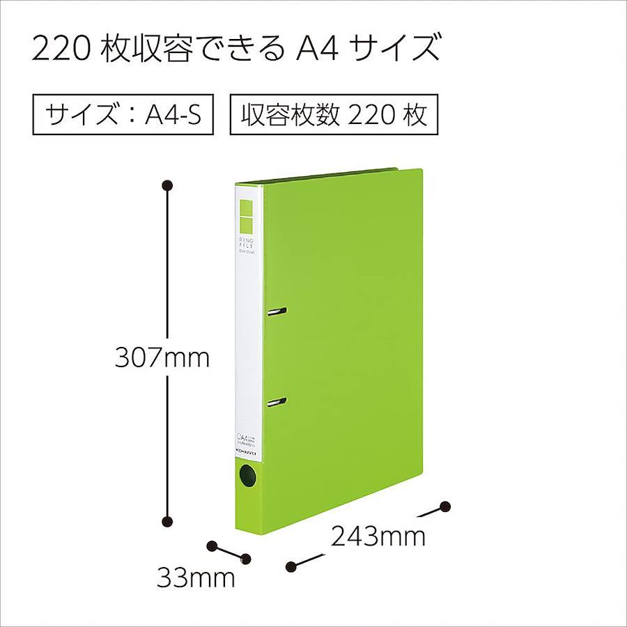 【寸法】 33×249×307mm【サイズ】 A4-S 【穴数】 2穴【色】 黄緑 【リング内径】 26mm【適正収容枚数】 220枚【免責事項】メーカーによる商品リニューアルに伴いパッケージが変更が行われた場合、新パッケージでお届け致します事ご了承願います。