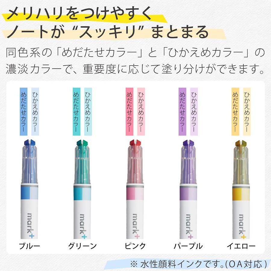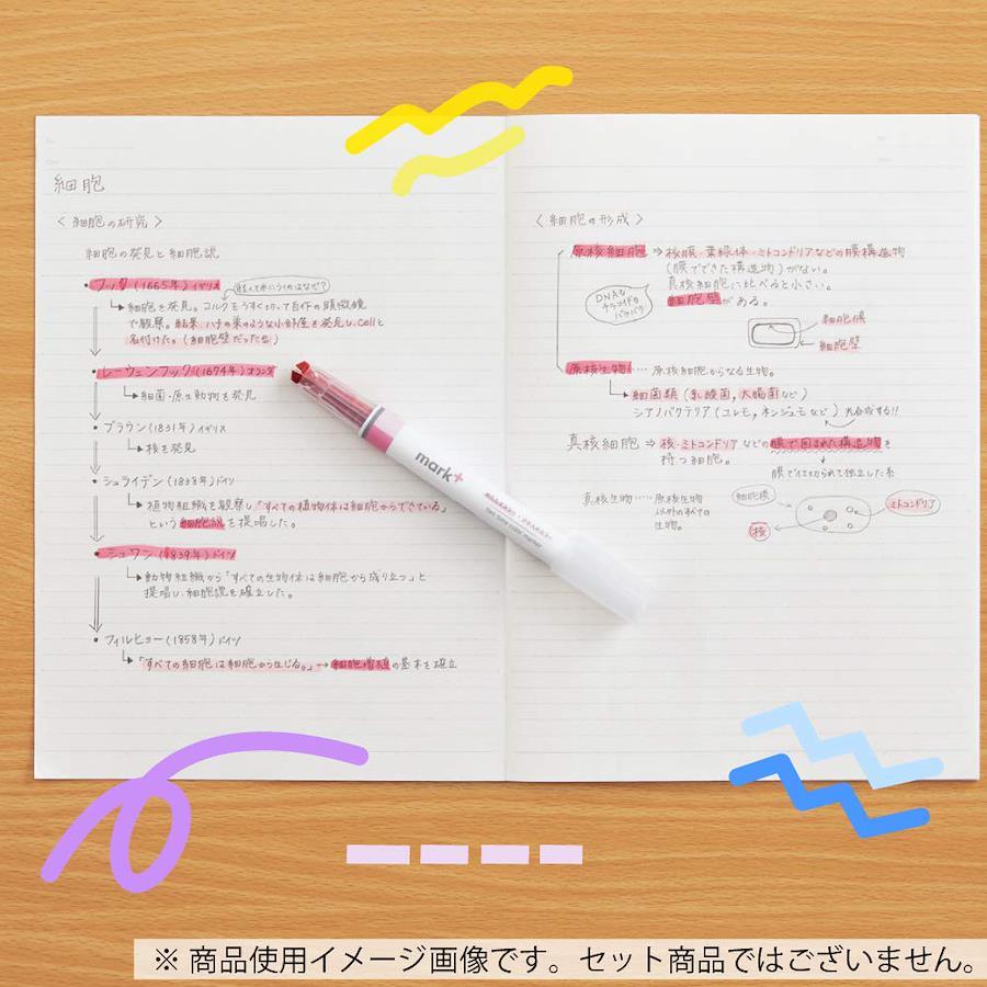 ノートがすっきりまとまる「1本で2色」のマーキングペン、マークタスの5色セット。