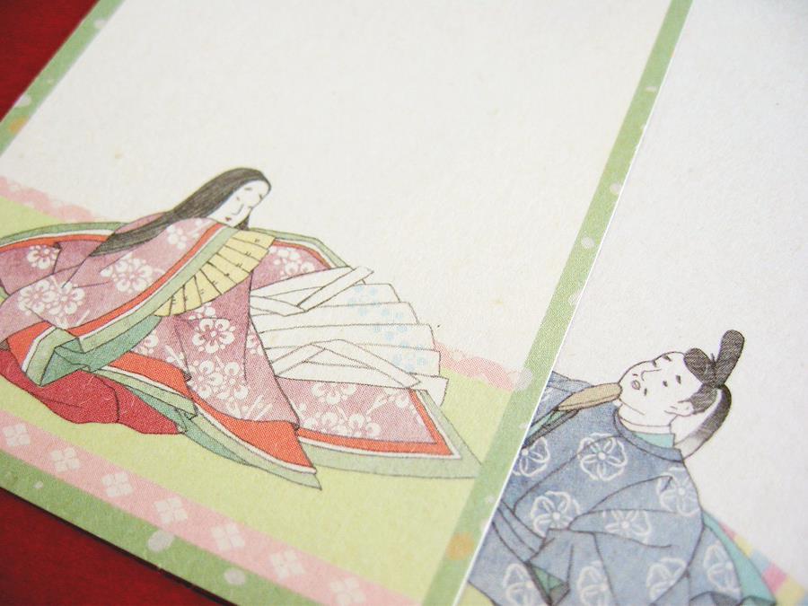 五・七・五・七・七の短歌にのせて、メッセージを伝えることができる便箋です。百人一首の歌人「殿」、「姫」、「坊主」に加え、誰もいない畳だけの「無人」の4種類で構成されています。「無人」の用紙には、人物を自由に描き込んだり、シールや切り抜きを貼るなどして楽しむことができます