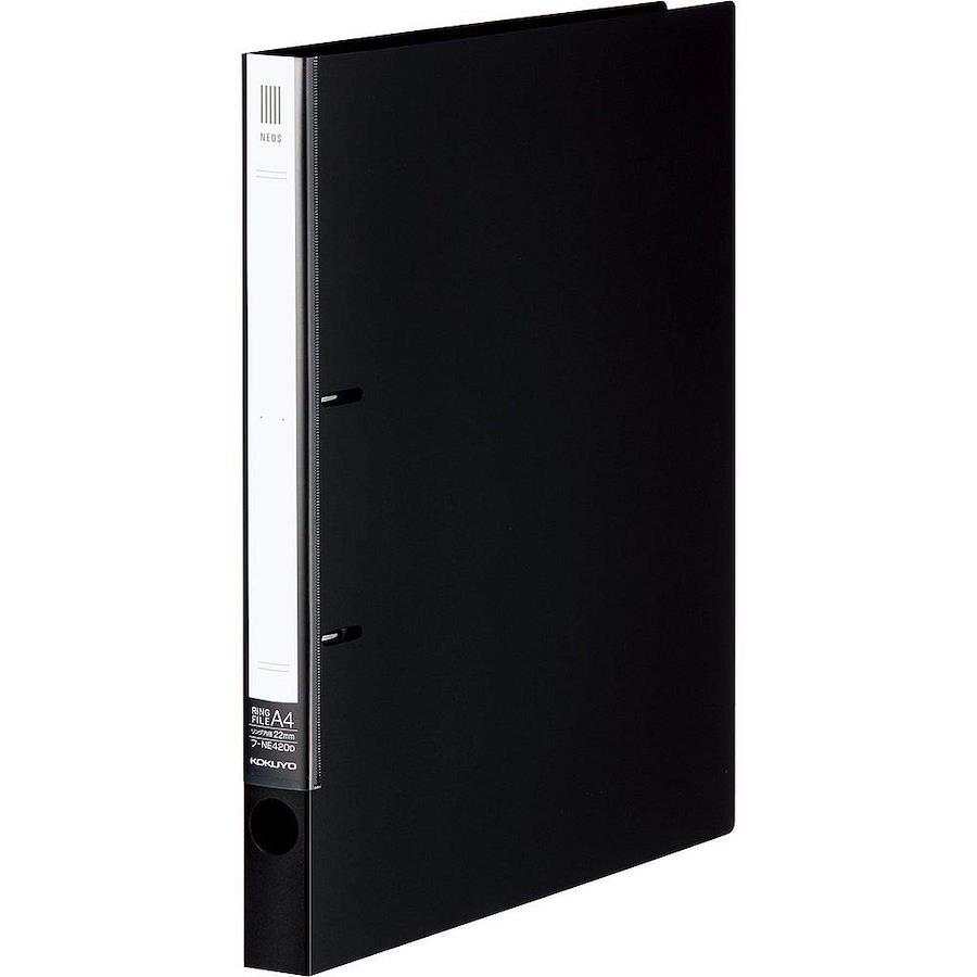 新定番ファイルシリーズ「NEOS」のリングファイル【カラー】 ブラック【サイズ】 A4(256×307×27mm)【穴数】 2穴 【とじ穴間隔】 80mmピッチ【リング内径】 22mm 【適正収容枚数】 180枚