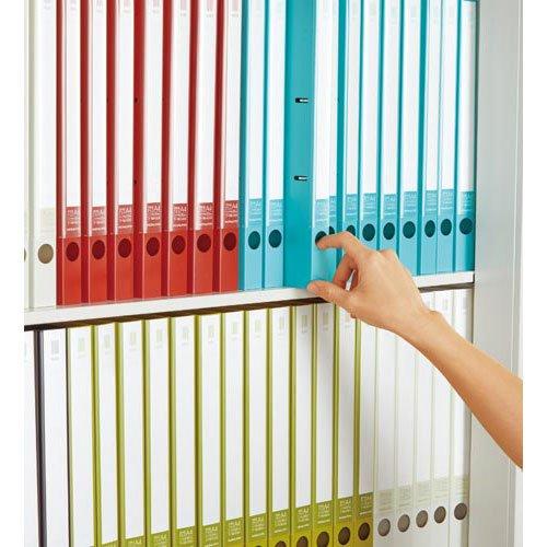 コクヨの〈NEOS〉シリーズ。保管庫はそのままで、書類をより多く収納できるスリムな背幅。とじ具はワンタッチで開閉できるので、書類の出し入れも簡単です。サイズ/A4-Sリング内径/22mm適正収容枚数/180枚外寸法/(高さ・幅・背幅)/307・256・27mm穴数/2穴とじ穴間隔/80mmピッチ材質/表紙:R-PP仕様/替背紙式、スリムリングカラー/ターコイズブルー単位(入数)/1セット(10冊入)メーカー品番/フ-NE420B×10