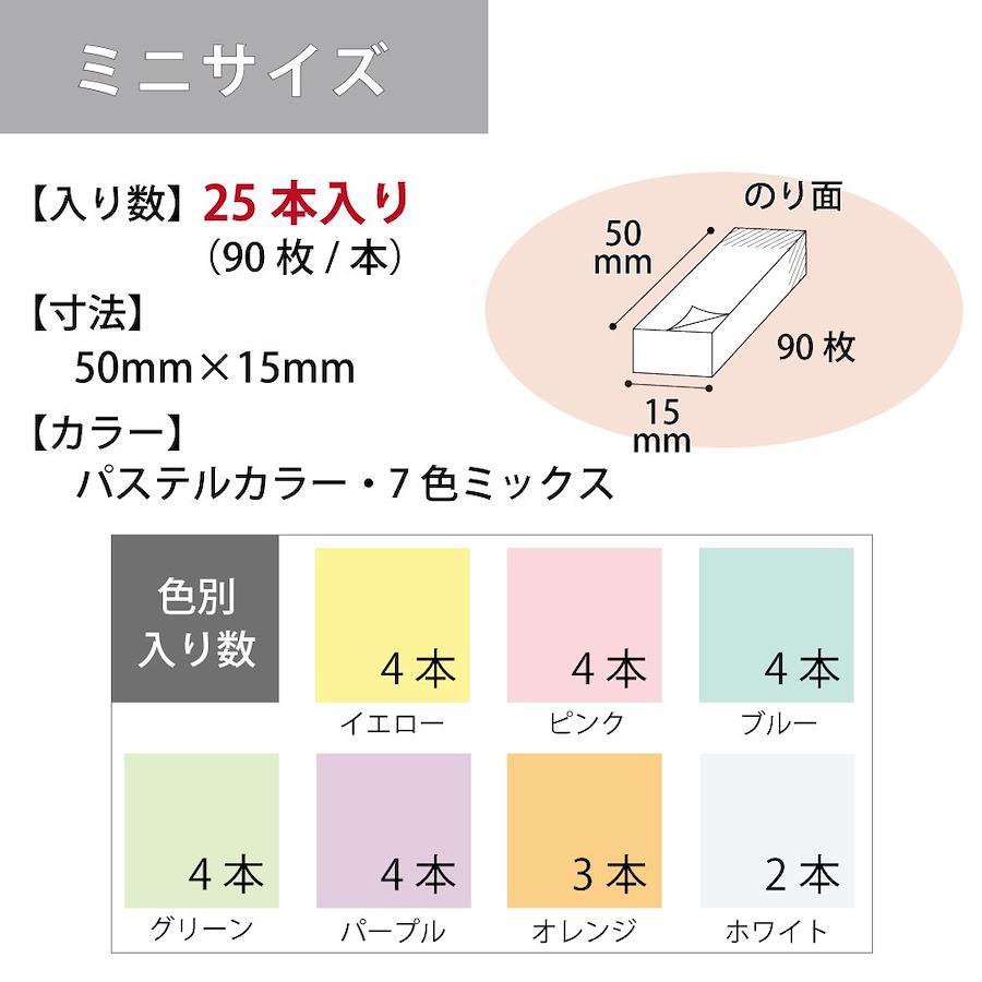しっかり貼れる強粘着タイプの付箋【種類】 ミニサイズ パステルカラー7色ミックス【カラー】 イエロー・ピンク・ブルー・グリーン・パープル:各4本、オレンジ:3本、ホワイト:2本【寸法】 50×15mm【枚数】 90枚×25本入り【免責事項】メーカーによる商品リニューアルに伴いパッケージが変更が行われた場合、新パッケージでお届け致します事ご了承願います。