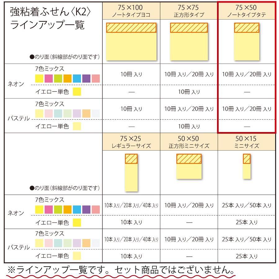 しっかり貼れる強粘着タイプの付箋【種類】 ノートタイプタテ ネオンカラー7色ミックス【カラー】 イエロー・マゼンタ・グリーン:各4冊、オレンジ・ブルー・パープル・ピンク:各2冊【寸法】 75×50mm【枚数】 90枚×20冊入り【免責事項】メーカーによる商品リニューアルに伴いパッケージが変更が行われた場合、新パッケージでお届け致します事ご了承願います。