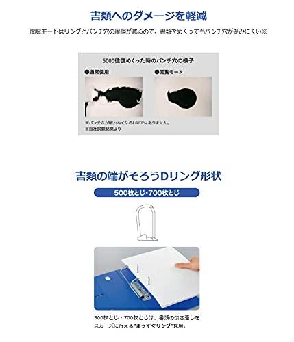 【商品説明】●ワンタッチで開く/リングを内側に片手でつまむだけで開き、上下のリングをつまむと閉じることができます。●しっかりロック/綴じ具がしっかりかみ合っているので、書類が抜け落ちる心配がありません。●まっすぐリング/書類の抜き差しをスムーズに行えるリング形状です。●閲覧モード/表紙をロックした閲覧モードでは、書類の紙めくりをスムーズに行うことができて、パンチ穴が傷みにくくなります。(従来のDリングファイルとの比較)●セミワイド表紙/通常のリングファイルよりもワイドな表紙サイズで、クリヤーポケットを綴じてもはみ出さずに使えます。●引き出し収容/コンパクトなとじ具の設計なので、デスクの引き出しにも収納可能です。●替え背紙式●背紙抜き出しホール/背紙の抜き出しをサポートする背紙抜き出し穴付きです。●フィンガーホール付き/棚からスムーズに取り出すことができます。●紙押さえ付き/紙押さえで書類を抑えることできます。●表紙ロック/表紙をロックをすると棚に並べた時に自立することができます。●内ポケット/穴をあける前の書類を一時保管できる内ポケット付きです。●綴じ枚数/700枚※ファイルの収容枚数の表示は、PPC用紙64g/m2を使用し、収容寸法1mmあたり10枚で算出しております。そのため、紙の種類によっては必ずしも計算通りにならない場合がありますので、一応の目安としてご利用ください。※クリヤーポケットのサイズによっては、表紙からはみだす場合がございます。