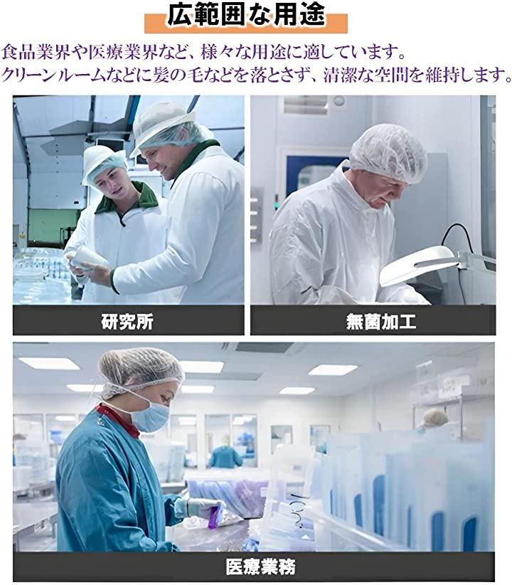 また、半導体業界や、エレクトロニクス、精密工場のクリーンルームでサージキャップとして、食品工場の衛生管理、調理室や給食用帽子として、毛髪混入を防止する使い切りヘアキャップです。