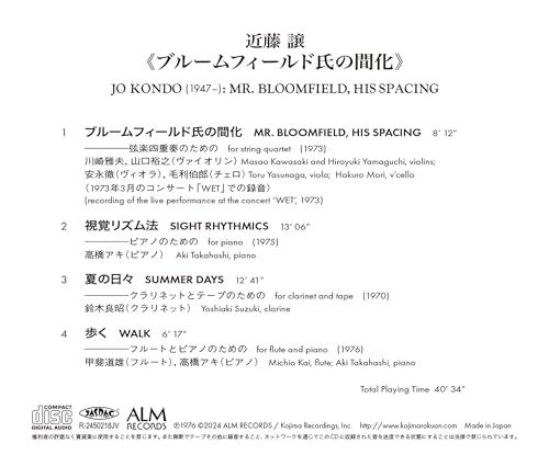 コジマ録音設立50年を記念して、1976年にLPで発売された名盤が初CD化。『線の音楽』のデザインを手掛けた近藤昌子によるジャケットもそのままに復刻。オリジナルマスターテープからのリマスター。寺の鐘、小鳥の鳴声、子どもの言葉遊びなどのフィールドレコーディングと、持続音的なクラリネット、セミの鳴き声を加工したホワイト・ノイズが入り乱れるミュージック・コンクレート作品「夏の日々」、強烈な弦楽四重奏曲「ブルームフィールド氏の間化」、5楽器によるアンサンブル作品をピアノ・ソロのために編曲した高橋アキ演奏による「視覚リズム法」、近藤譲の根源的な形式『形と影』を明快に示すフルートとピアノのための「歩く」を収録。
