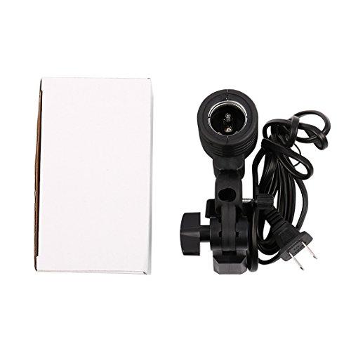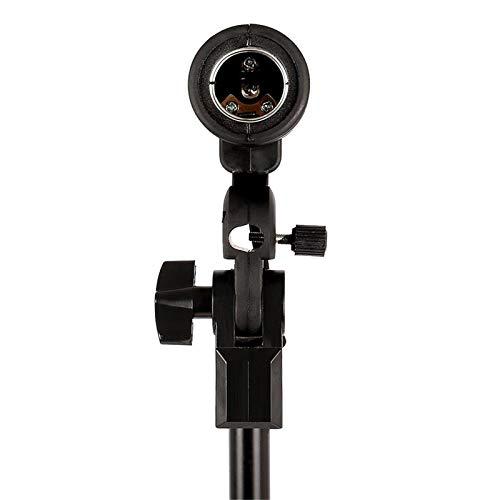 電源コード:164 cm、操作電圧:100~220VE26の電球に適用できる撮影ソケットです。ご注意:写真のアンブレラ、電球、ライトスタンドが含まれていません。傘用穴付き、撮影用アンブレラに適用され、ノブを締めて傘を固定することができるアンブレラホルダーです。底部にある取り付け穴は、三脚スタンドを取り付けられます。