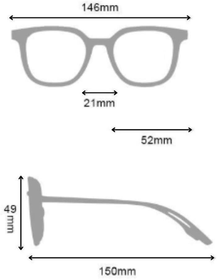 「素材」フロント:軽量TR90 レンズ:プラスチック「サイズ」フレーム幅146mm/ブリッジ幅21mm/レンズ横長さ52mm/レンズ高さ49mm/テンプル長さ150mm 「カラー」フレーム:ブラック、ホワイト(太い/細い) レンズ:グラデーション入りクリア 「重量」16g