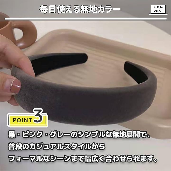 「製品仕様」幅:約3cm/厚み:約3cm/材質:ベルベット調布料/形状:幅広カチューシャ/カラー:黒・ピンク・グレー/用途:日常・フォーマル・アクセント