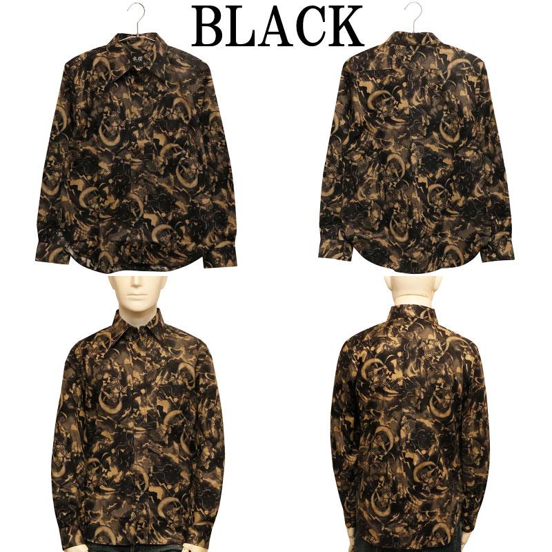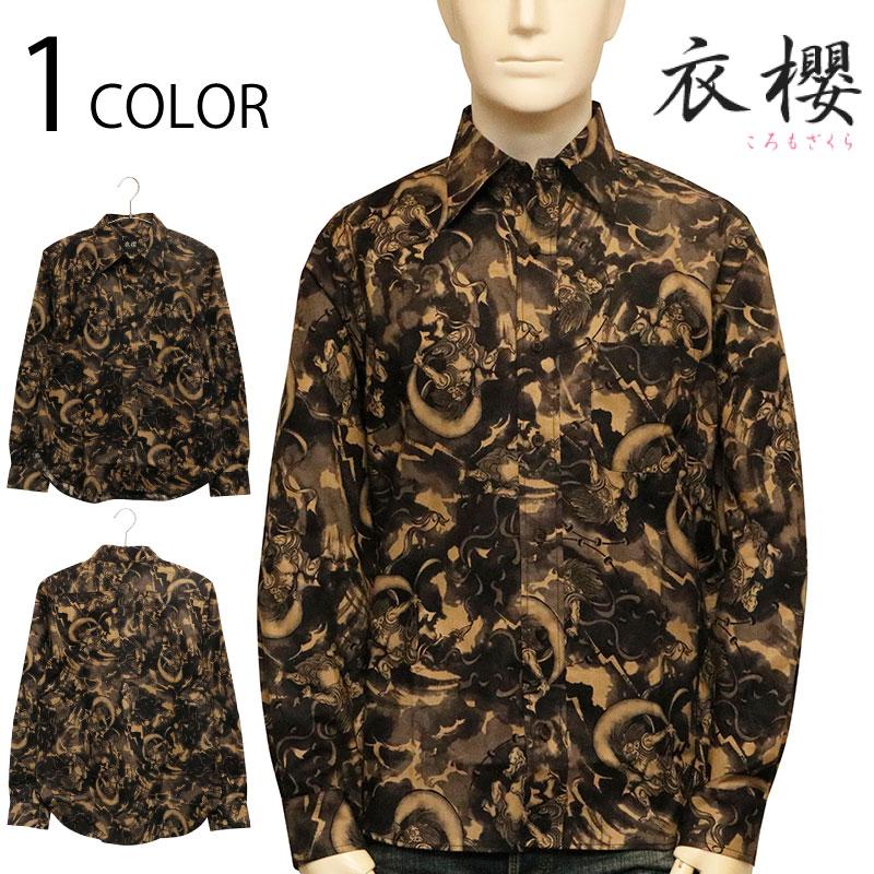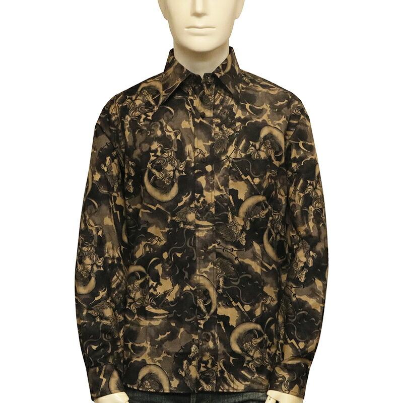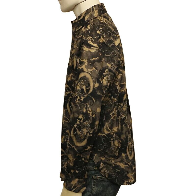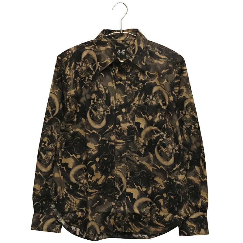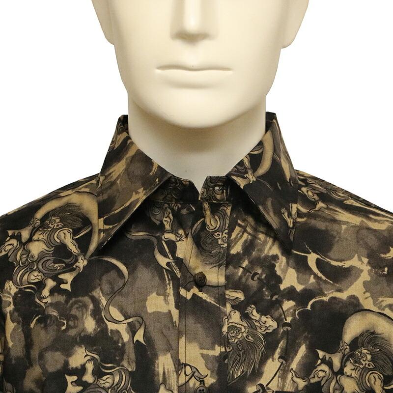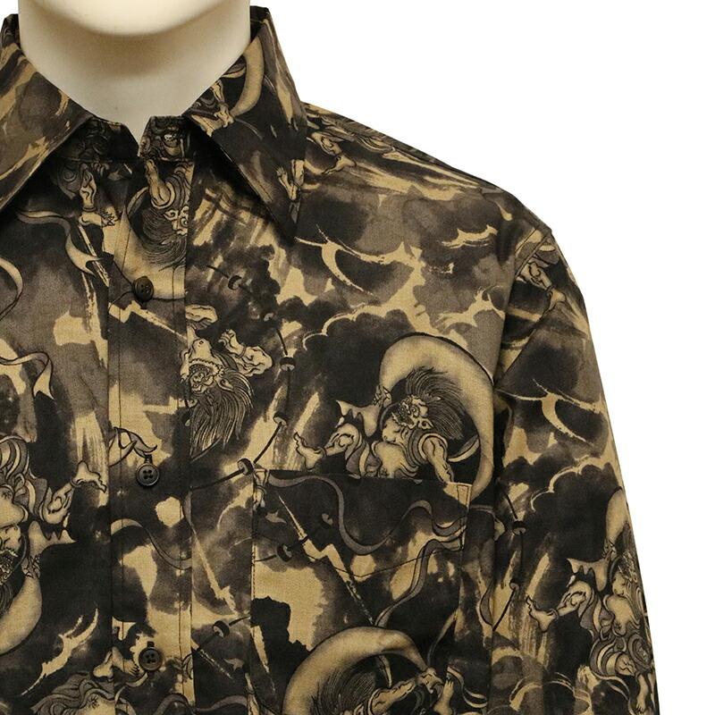 ムラ染め抜染調 風神雷神 柄 シーチング 素材 和柄 長袖 レギュラー シャツ