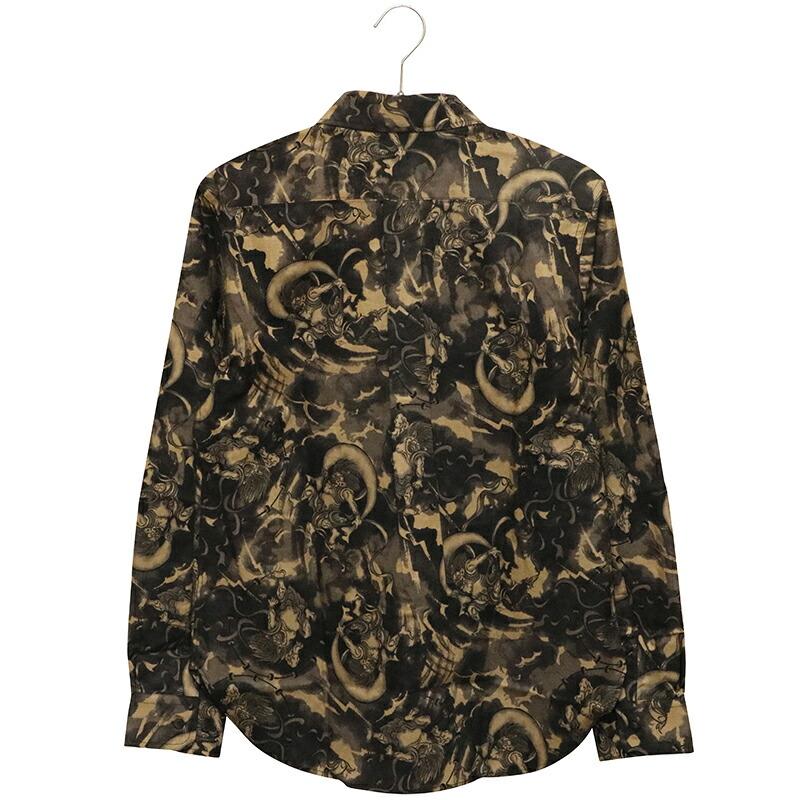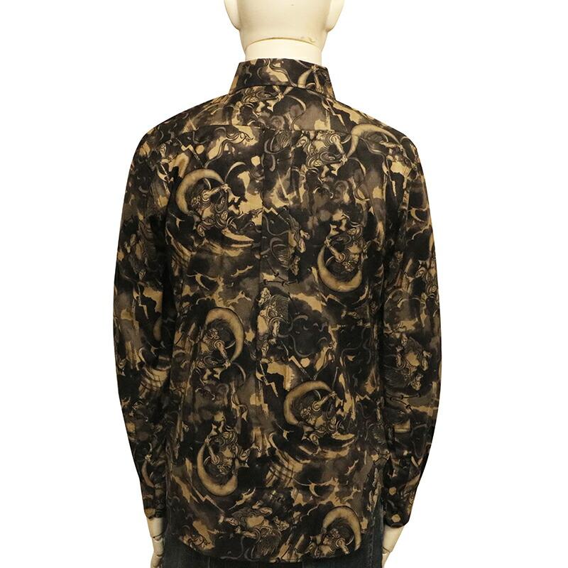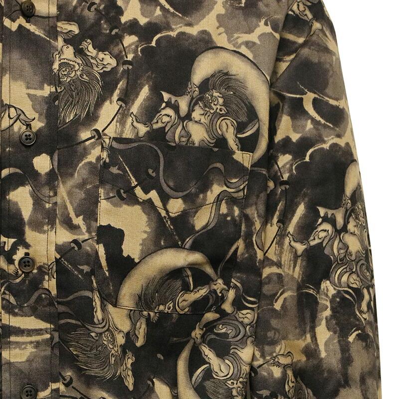 ムラ染め抜染調の生地に和柄の定番柄の風神雷神を総柄であしらった長袖シャツ。
