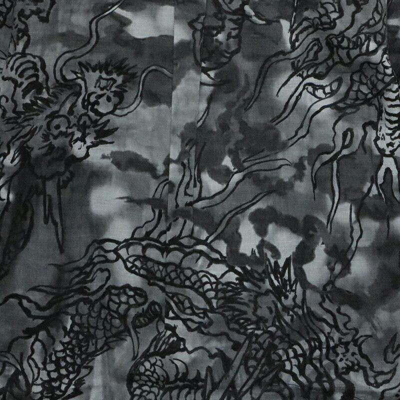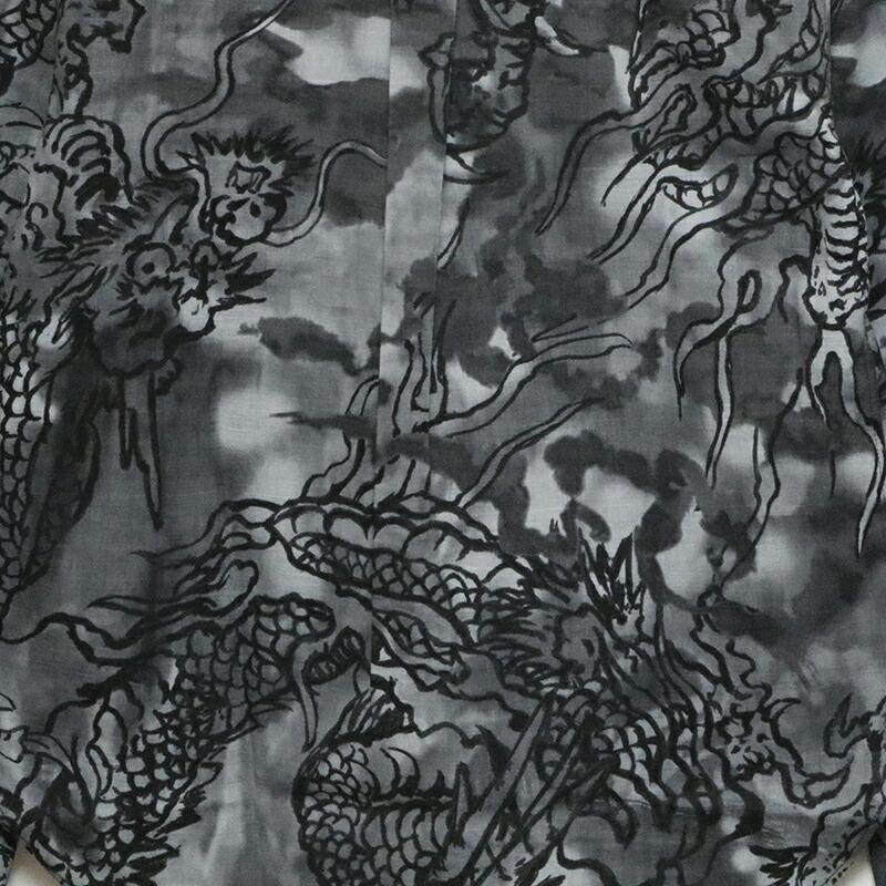 ムラ染め墨絵調の生地に老龍を総柄であしらった長袖シャツ。