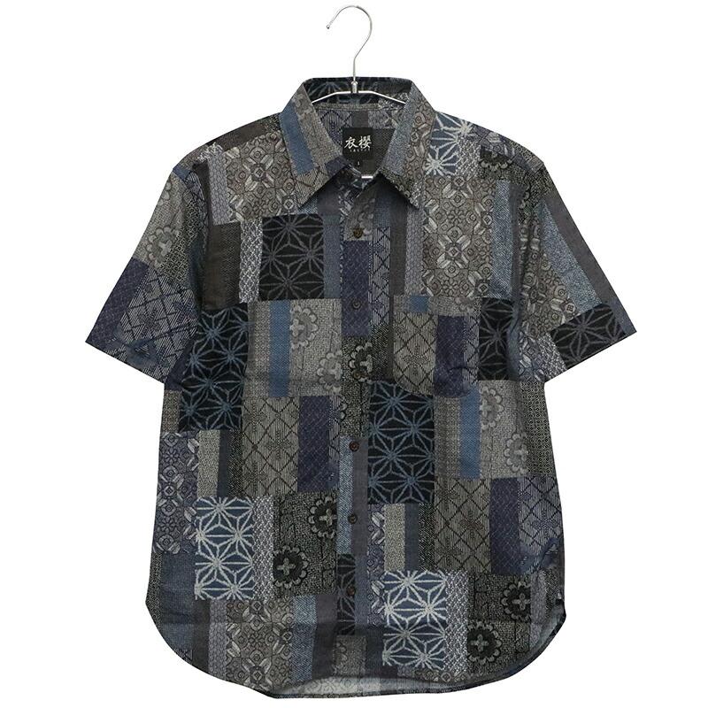 大島紬調パッチワークプリント 柄 和柄 半袖 レギュラーカラー シャツ サザンクロス 素材