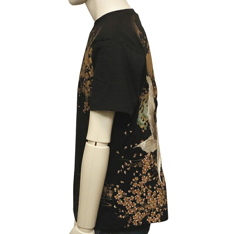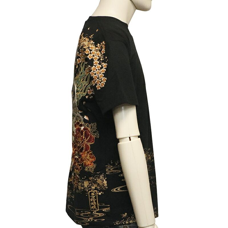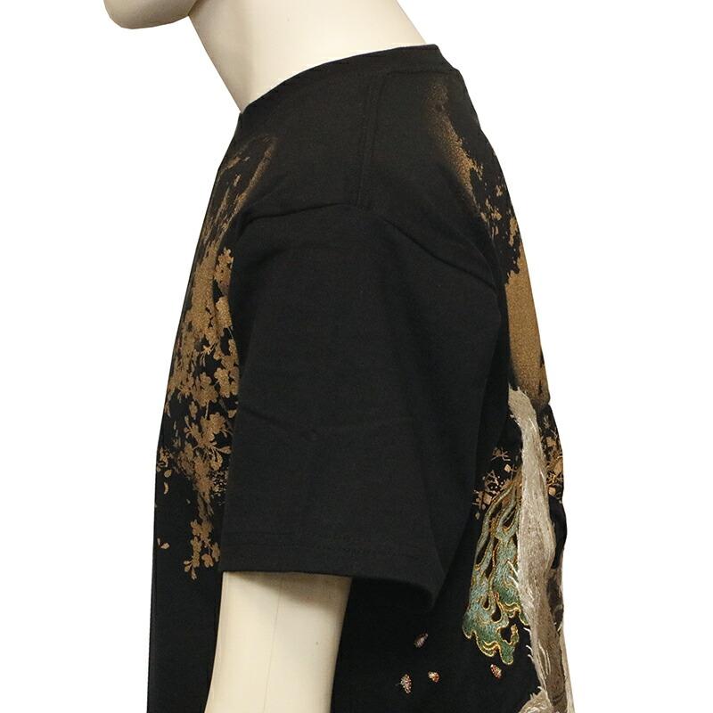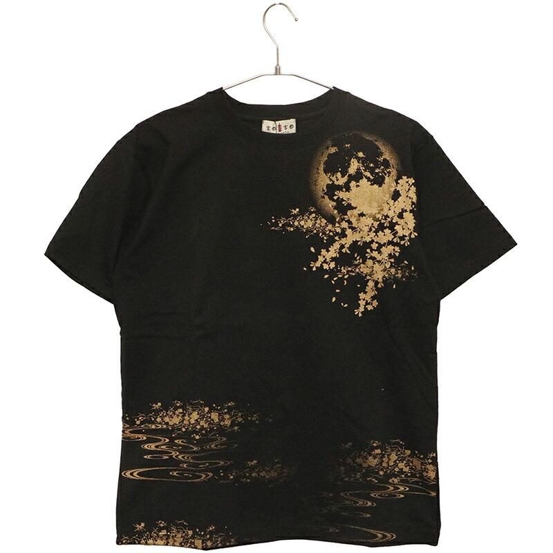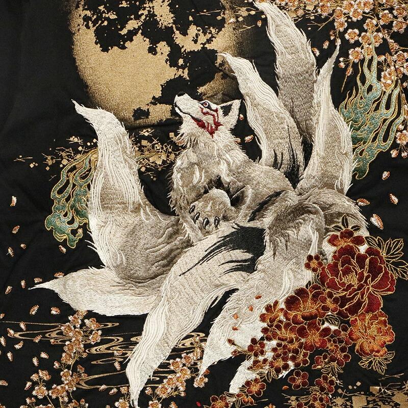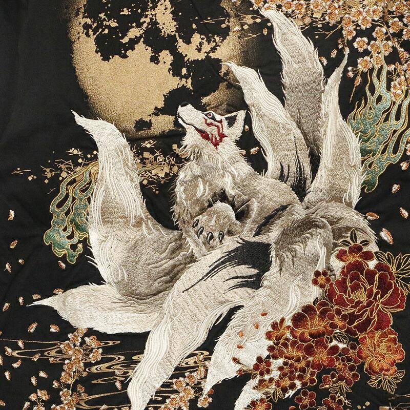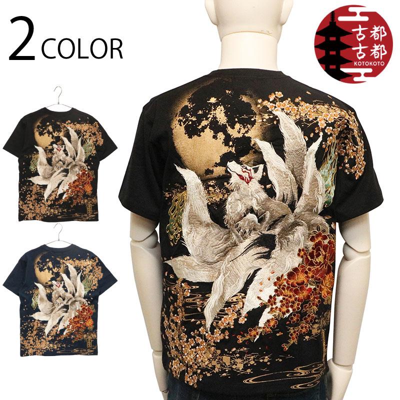 【デザイン】古都古都 × 絡繰魂 粋から和柄半袖Tシャツのご紹介です。満月と九尾の狐 柄 刺繍 和柄 半袖Tシャツです。以前絡繰魂粋で好評だったデザインを古都古都でリバイバルしました。妖怪九尾の狐を落とし込んだ半袖Tシャツ。背面に満月と桜、流水を背景に夜空を見上げる九尾の狐の姿を迫力ある構図で刺繍で落とし込みました。フロントには、左胸に満月と桜をラメ入りプリント配置し、下身頃にも桜と流水をプリント。刺繍やラメ入りプリントなどで豪華で迫力のある半袖Tシャツに仕上がりました。