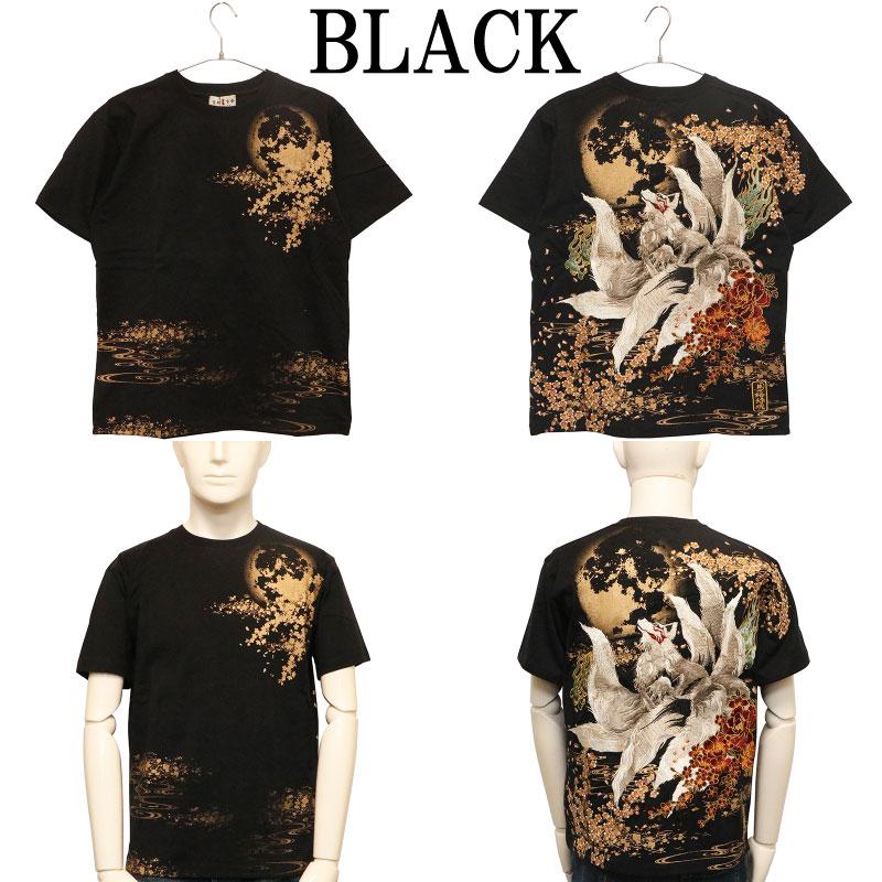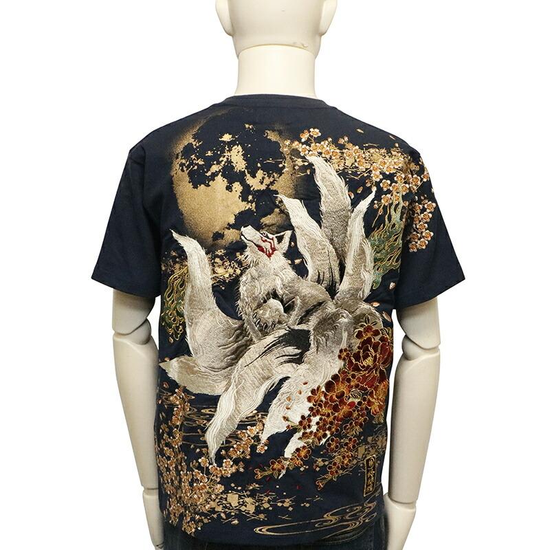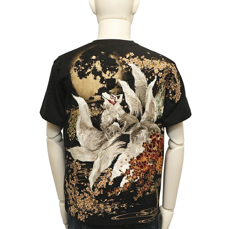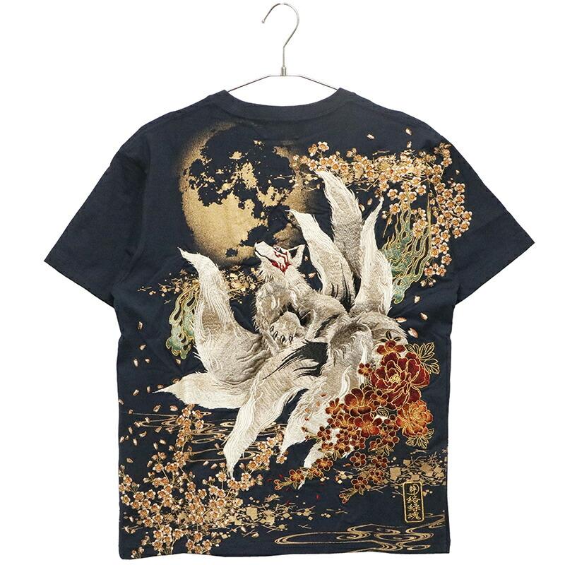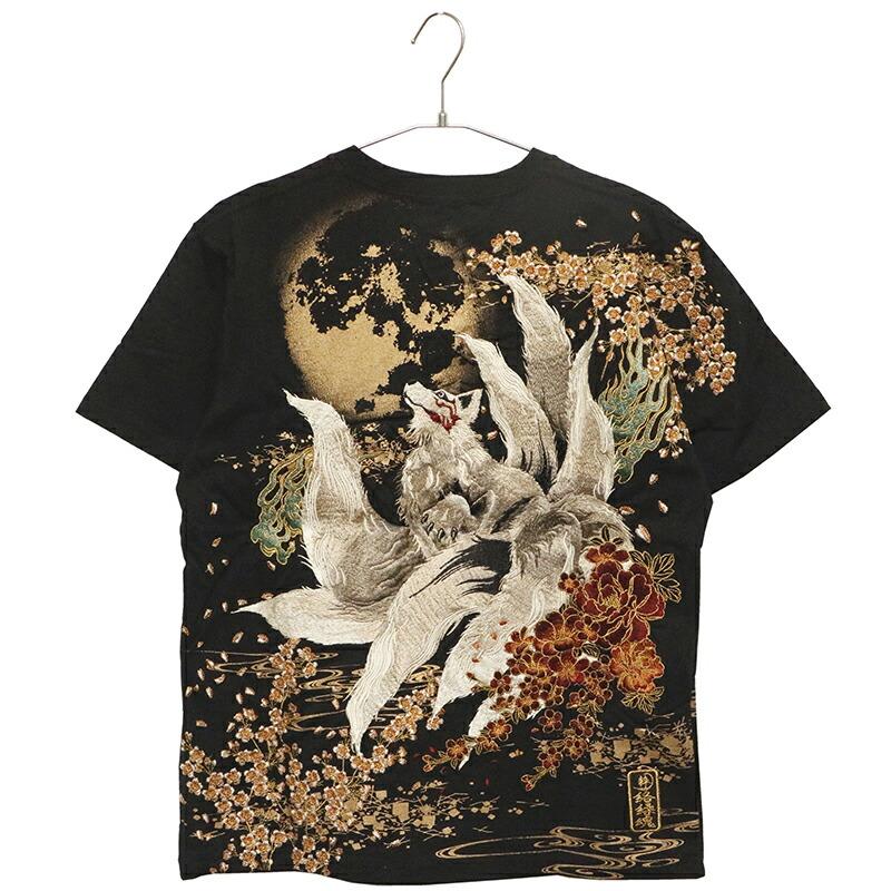 【商品名】満月と九尾の狐 柄 刺繍 和柄 半袖Tシャツ