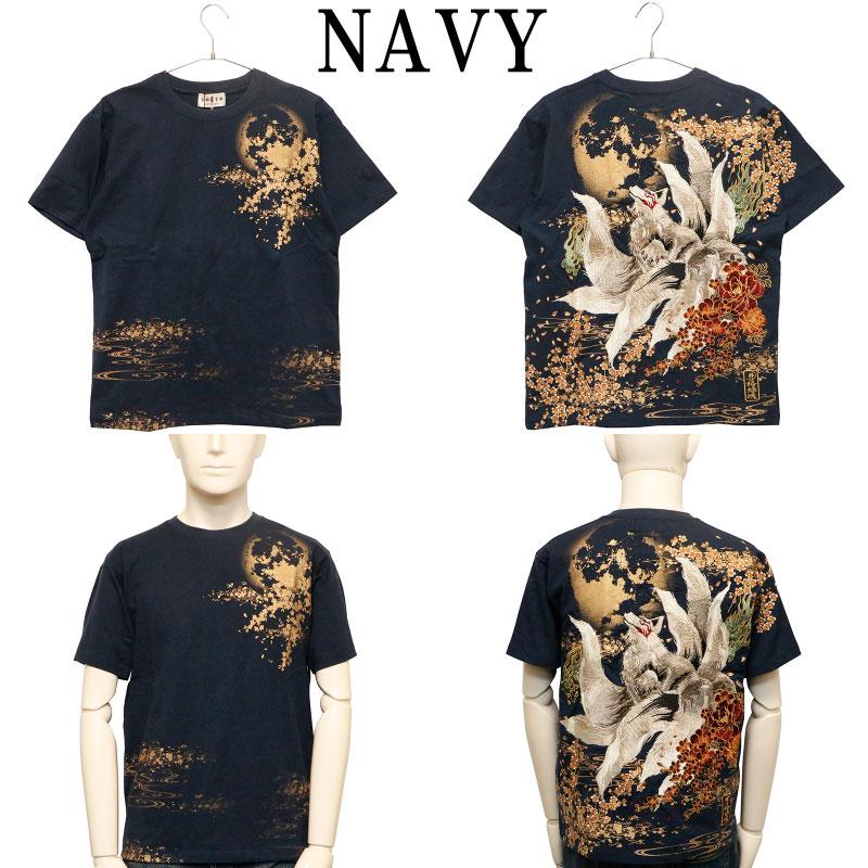 Koto Koto x Karakuridama Iki Full Moon and Nine Tailed Fox Pattern Embroidered Japanese Pattern Short Sleeve T-Shirt (B242094) NAVY L