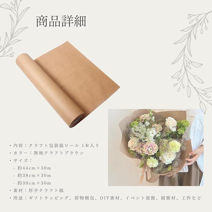 「商品詳細」 ・内容:クラフト包装紙ロール 1本入り ・カラー:無地クラフトブラウン ・サイズ: - 約44cmx30m - 約38cmx30m - 約30cmx30m ・素材:厚手クラフト紙 ・用途:ギフトラッピング、荷物梱包、DIY素材、イベント装飾、緩衝材、工作など