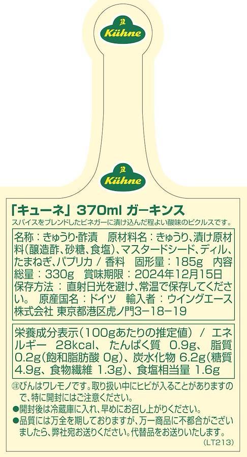 西洋きゅうりを、スパイスをブレンドしたビネガーに漬け込んだほど良い酸味のピクルスです。キューネ社のガーキンスは長い歴史と伝統に培われたレシピで作られ、ビールのおつまみやサラダのトッピング、各種料理の添え物などに合う汎用性の高い商品です。キューネ社は、1722年にJohann Daniel Epiniusが始めたビネガー製造会社です。1761年にキューネファミリーによって引き継がれたビネガー工場は、1832年にCarl Kuhneによって飛躍的な発展を遂げ、現在のキューネ社の基盤を築き上げました。以来キューネ社は、最先端技術の導入はもとより、商品革命と伝統、ブランドへのこだわりを持ち続けています。今日ではドイツ国内でトップシェアを誇るキューネ社の製品は世界中のグルメから愛され、親しまれています。その豊かな風味とアイデアに富んだ製品は、ヨーロッパをはじめ世界の市場へ送り出されています。