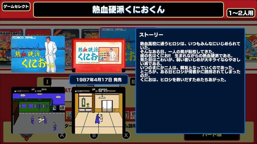 当時のままも、修正版も楽しめるお得システム!あんな裏技、こんな裏技が楽しみの一つでもある「くにおくん」。そのままを楽しめるオリジナルバージョンはもちろん、ほとんどのタイトルでクオリティアップさせたバージョンも搭載! また、ちらつき・処理落ちも大幅カットして遊びやすくなっているぞ!