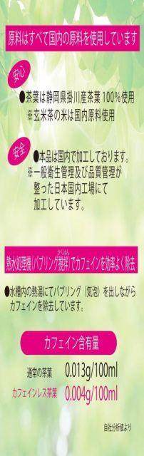 商品紹介静岡県掛川産茶葉を熱湯処理をしてカフェインを取り除き、焙煎前に十分に乾燥させて焼き上げることで、香り高いほうじ茶に仕上げました。カフェイン量は抽出液で0.005g未満です。おやすみ前でも気軽に飲めるノンカフェインほうじ茶のティーバッグです原材料・成分茶(静岡県)使用方法茶袋を1個使用し、お湯を注いでください。適宜、お好みの甘さに調整してください。安全警告お茶は湿気をおびやすいため開封後をお早めにお飲みください。