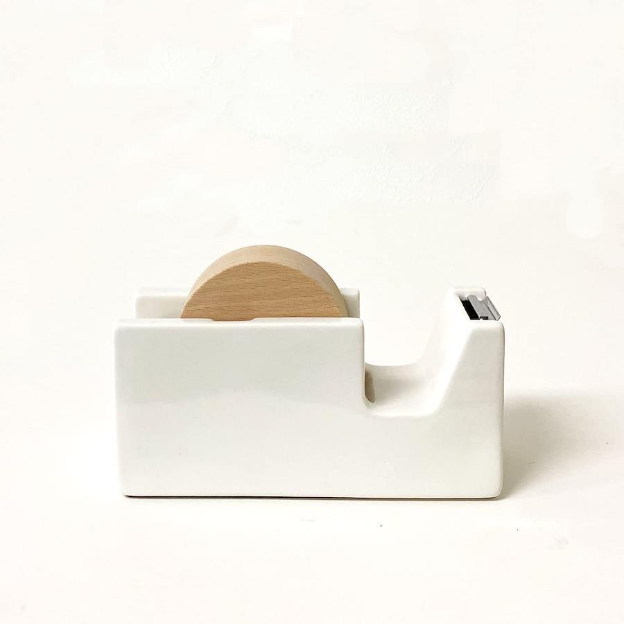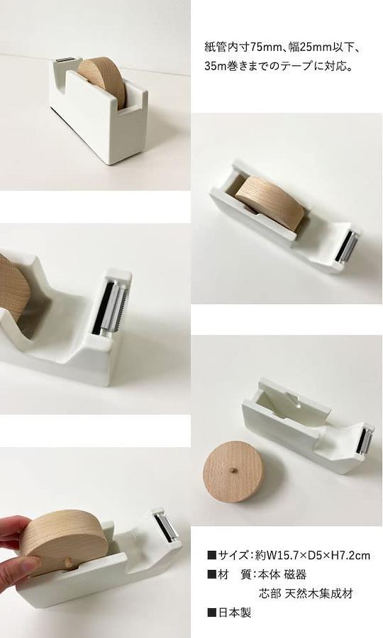 サイズ:幅161mm×厚さ53mm×高さ75mm素材:磁器(本体)、天然木集成材(芯部)紙管内寸75mm、幅25mm以下・35m巻きまでのテープに対応します日本製