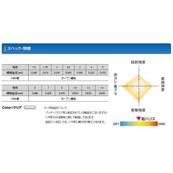 水に溶けるような透明感!クリスタルクリアの船専用フロロハリス!「強さ」と「しなやかさ」の絶妙なバランスを持った船専用ハリスです。大口径スプールと高い撥水性で実現した糸さばきの良さ、水に近い屈折率のクリアラインで、水中のカモフラージュハリスを演出します。また、極めて低い吸水性で、長時間の水中使用でも高強度を維持します。