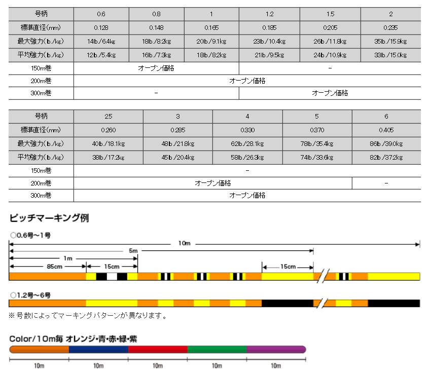 0.6号:標準直径(mm):0.1280.8号:標準直径(mm):0.1481号:標準直径(mm):0.1651.2号:標準直径(mm):0.1851.5号:標準直径(mm):0.2052号:標準直径(mm):0.2352.5号:標準直径(mm):0.2603号:標準直径(mm):0.2854号:標準直径(mm):0.3305号:標準直径(mm):0.3706号:標準直径(mm):0.405