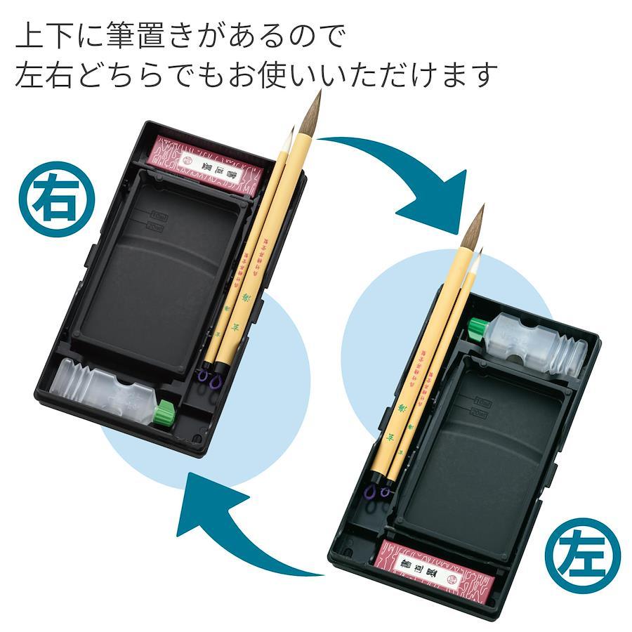 左右両用、書道用具を収納できる機能的で便利な「書道用具収納ケース」です墨・水差し・硯・文鎮を収納できます。筆置きが上下にあるので、左右どちらの方向でもお使いいただけます。