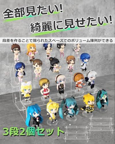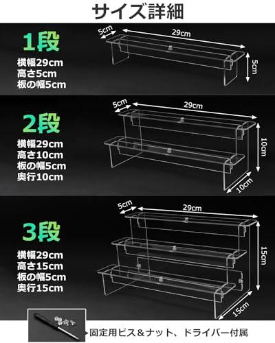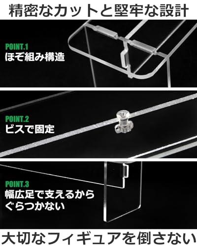 フィギュアやアクスタを綺麗に見せるスタンドです。お部屋のコンパクトなスペースでもボリューム感のある陳列をしていただくことが可能です。 ??フィギュアやアクスタを綺麗に見せるスタンドです。お部屋のコンパクトなスペースでもボリューム感のある陳列をしていただくことが可能です。 ??他社製品にはない新構造により、ぐらつきガタツキがなく堅牢な設計です。 固定ネジやほぞも透明ですので丈夫さと美しさを兼ね備えています。 ??1段から3段までがスペースやアイテムに応じてお選びいただけます。 横幅30㎝以上のフィギュアケースでは中に入れてご使用して頂くことも可能です。 ??透明度の高い高品質なアクリル(可視光線透過率93%)を使用しています。厚さは2.2㎜が丈夫さと美しさと軽さのバランスの最適を考えて採用されました。 ??透明な固定用のビス&ナット、組み立て用ドライバー、説明書とあなたの組み立てを十分にサポートするための付属品が充実しています。