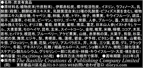 【大容量 1年分 365粒】炭ダイエット 活性炭 チャコールサプリメント 竹炭 赤松炭 活性炭 3種の高級食用炭を配合。1日1粒目安。お水やヨーグルトなどでお召し上がりくださいませ。コンブチャ (発酵紅茶エキス) と合計22種類/405億個の乳酸菌&ビフィズス菌を追加配合。快適な 腸活 をサポート致します。更に、75種類の植物酵素を贅沢に配合。不足しがちな野菜と果物を補給し、健康的なダイエット生活にお役立て下さい。【原材料】植物炭末(竹炭粉末) 、伊那赤松炭、椰子殻活性炭、イヌリン、ラフィノース、乳酸菌(殺菌)、醗酵紅茶エキス末、乳酸菌混合末(22種の乳酸菌・ビフィズス菌を含む)、植物醗酵エキス(黒砂糖、キャベツ、苺、林檎、大根、トマト、柚子、柿果実、キウイフルーツ、胡瓜、茄子、法蓮草、小松菜、ピーマン、セロリ、ゴーヤ、紫蘇、人参、プルーン、蓬、大豆(遺伝子組み換えでない)、オリゴ糖、葡萄、桃果実、蜜柑、南瓜、霊芝、ケール、大麦若葉、モロヘイヤ、昆布、玄米、スイートコーン、金柑、椎茸、米糠、檸檬、ココア、木耳、若布、ヒバマタ、根昆布、ブルーベリー、山桃、大葉子、熊笹、杉菜、枇杷の葉、舞茸、ヒジキ、梨、青梗菜、梅、蓮根、鬱金、伊予柑、ビタミン菜、無花果、山葡萄、牛蒡、ブロッコリー、生姜、花梨、パセリ、アスパラガス、芹、木苺、三ツ葉、茗荷、グミ、ブラックベリー、冬苺、他)、デキストリン、乳糖 / 結晶セルロース、HPC、ショ糖エステル、微粒二酸化珪素、ステアリン酸カルシウム、グリセリン(一部に乳成分・林檎・キウイフルーツ・大豆・桃を含む) 【大容量 1年分 365粒】炭ダイエット 活性炭 チャコールサプリメント 竹炭 赤松炭 活性炭 3種の高級食用炭を配合。1日1粒目安。お水やヨーグルトなどでお召し上がりくださいませ。 コンブチャ (発酵紅茶エキス) と合計22種類/405億個の乳酸菌&ビフィズス菌を追加配合。快適な 腸活 をサポート致します。更に、75種類の植物酵素を贅沢に配合。不足しがちな野菜と果物を補給し、健康的なダイエット生活にお役立て下さい。 【原材料】植物炭末(竹炭粉末) 、伊那赤松炭、椰子殻活性炭、イヌリン、ラフィノース、乳酸菌(殺菌)、醗酵紅茶エキス末、乳酸菌混合末(22種の乳酸菌・ビフィズス菌を含む)、植物醗酵エキス(黒砂糖、キャベツ、苺、林檎、大根、トマト、柚子、柿果実、キウイフルーツ、胡瓜、茄子、法蓮草、小松菜、ピーマン、セロリ、ゴーヤ、紫蘇、人参、プルーン、蓬、大豆(遺伝子組み換えでない)、オリゴ糖、葡萄、桃果実、蜜柑、南瓜、霊芝、ケール、大麦若葉、モロヘイヤ、昆布、玄米、スイートコーン、金柑、椎茸、米糠、檸檬、ココア、木耳、若布、ヒバマタ、根昆布、ブルーベリー、山桃、大葉子、熊笹、杉菜、枇杷の葉、舞茸、ヒジキ、梨、青梗菜、梅、蓮根、鬱金、伊予柑、ビタミン菜、無花果、山葡萄、牛蒡、ブロッコリー、生姜、花梨、パセリ、アスパラガス、芹、木苺、三ツ葉、茗荷、グミ、ブラックベリー、冬苺、他)、デキストリン、乳糖 / 結晶セルロース、HPC、ショ糖エステル、微粒二酸化珪素、ステアリン酸カルシウム、グリセリン(一部に乳成分・林檎・キウイフルーツ・大豆・桃を含む) 1年分の大容量サプリメントですので、ご家庭用のみならず、業務用としてもお使いいただけます。
