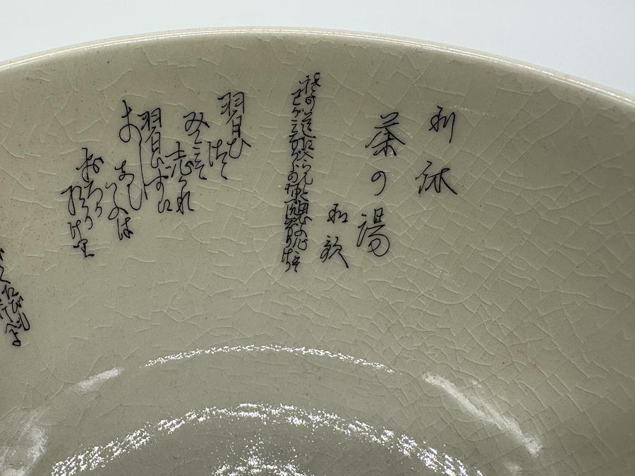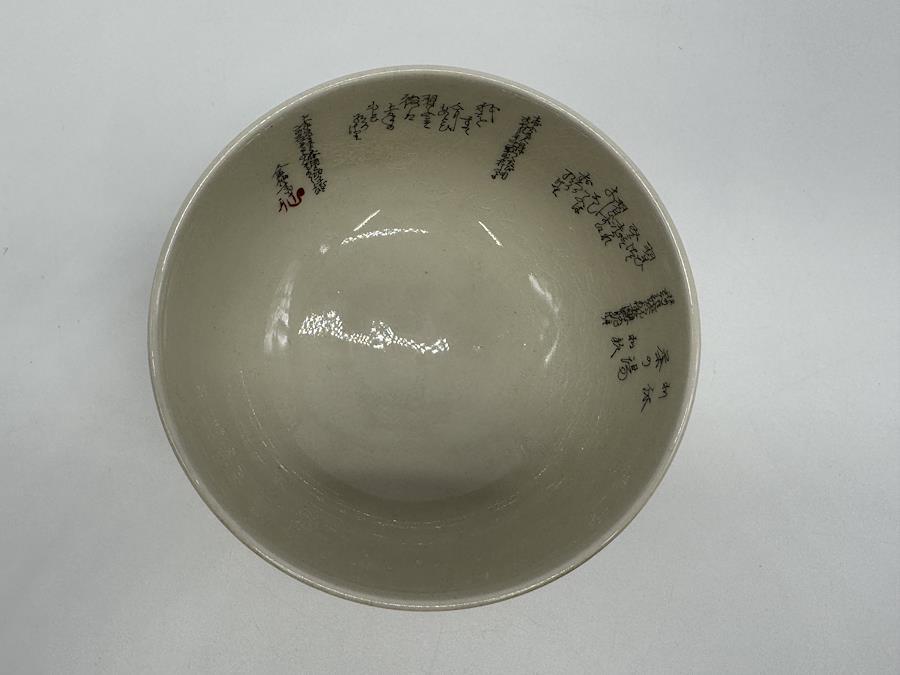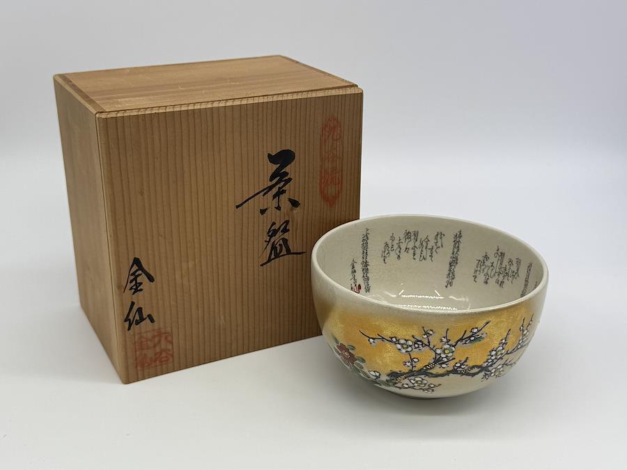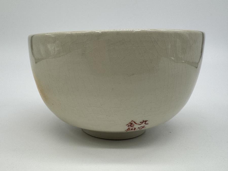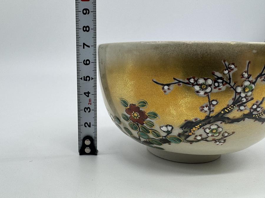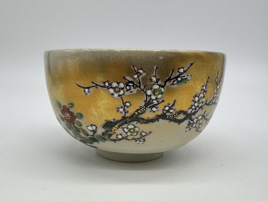 九谷焼の茶碗になります。茶碗の内側には千利休の茶の湯という和歌が書かれています。外側のデザインは梅の花です。