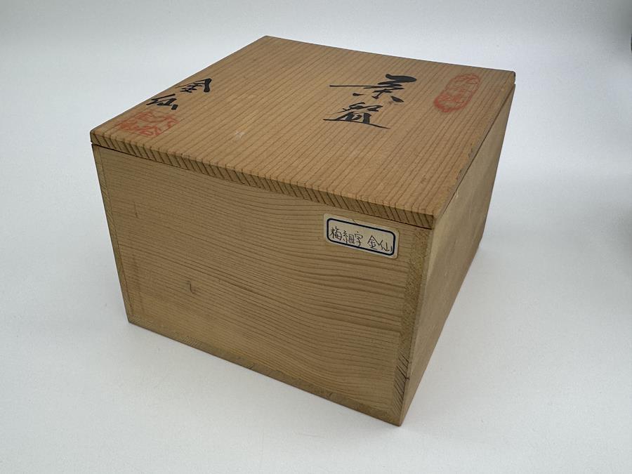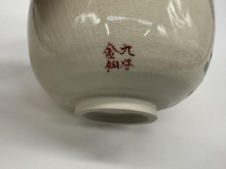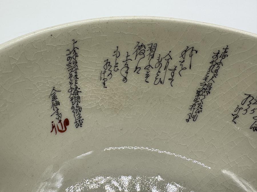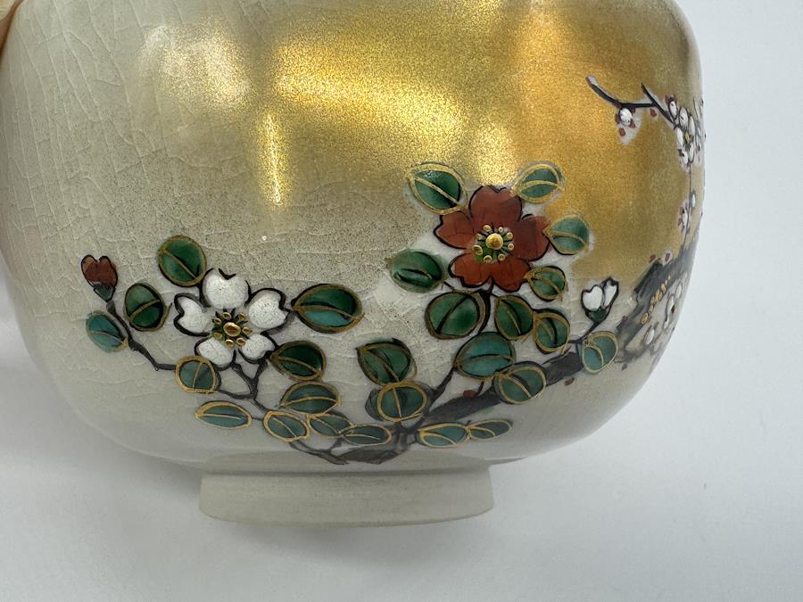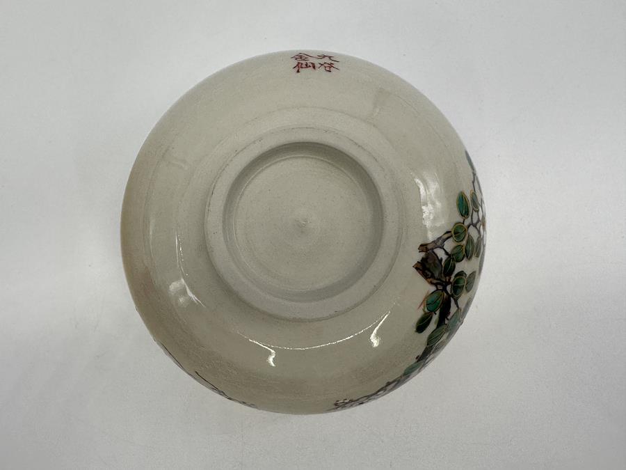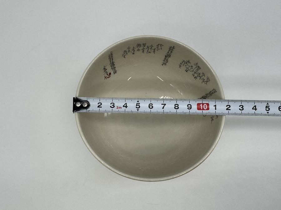 九谷焼の茶碗になります。茶碗の内側には千利休の茶の湯という和歌が書かれています。外側のデザインは梅の花です。