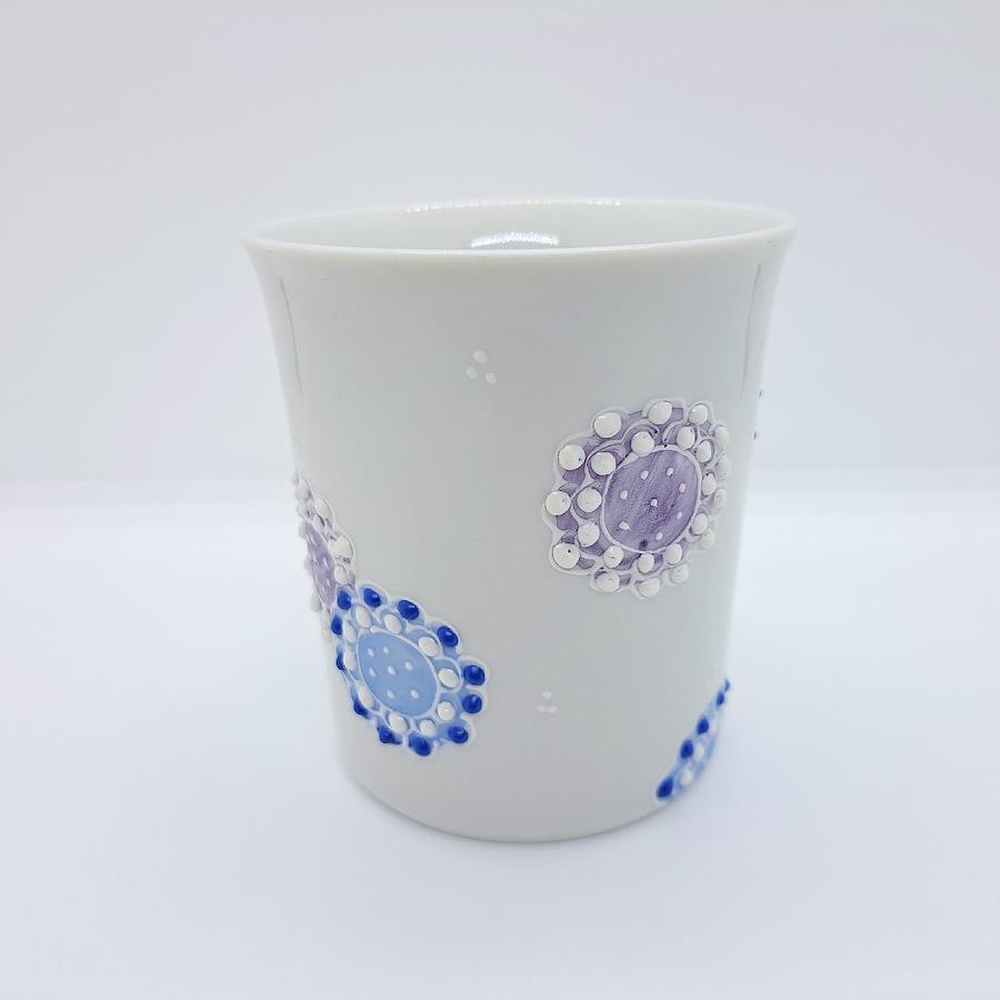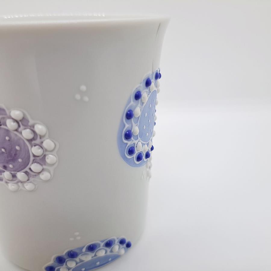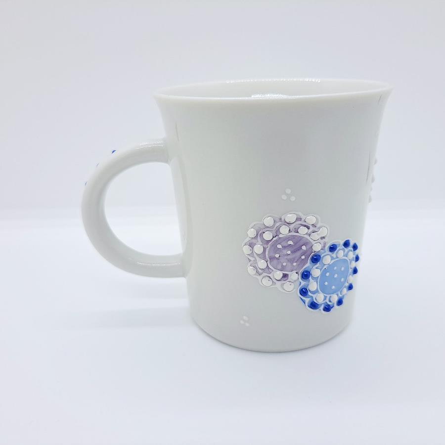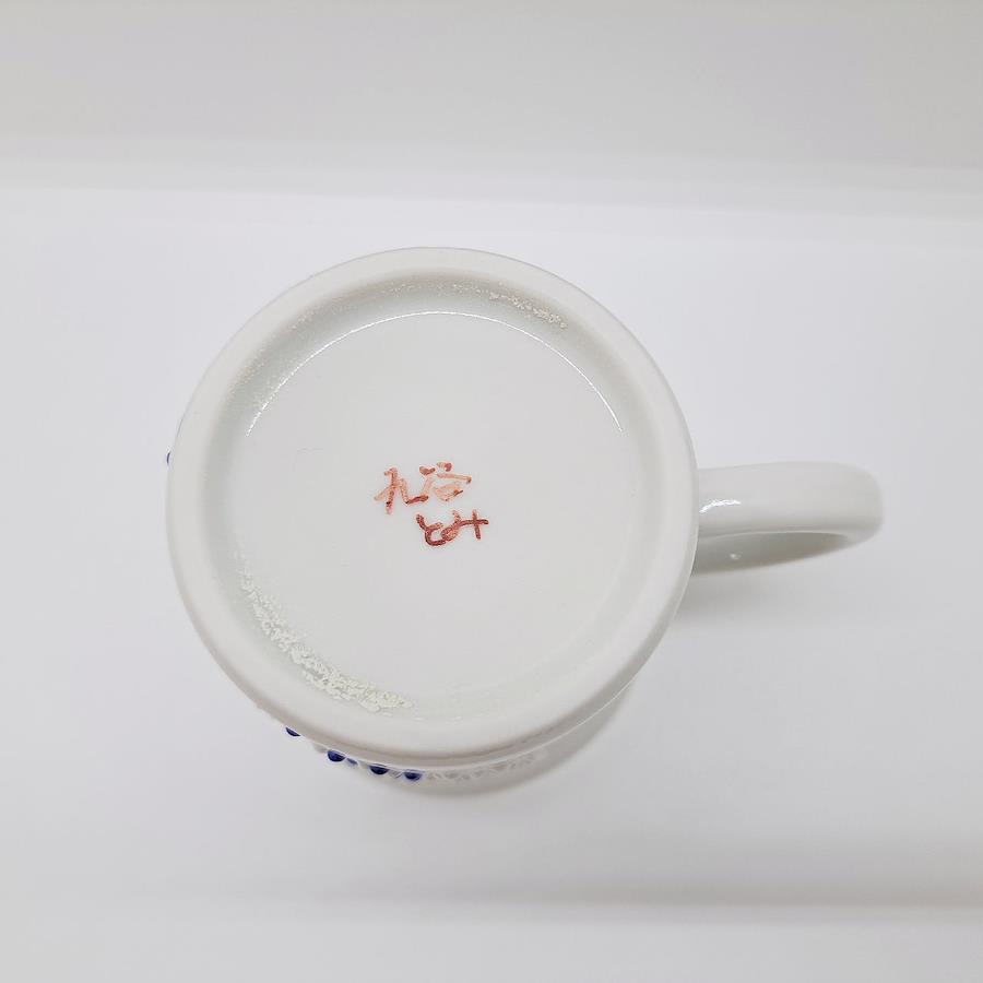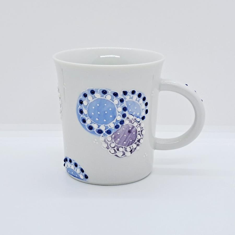 Kutani Ware Mug: Fireworks - Blue九谷伝統技法「盛」。いっちんと呼ばれる独自の道具を使用して絵具を先端から絞り出し立体的に描きます。花火の色が「盛り」上げて表現され、華やかな絵柄が魅力です。電子レンジ:温め程度可食洗機:使用不可本体サイズ:約径8.1×高さ8.8cm