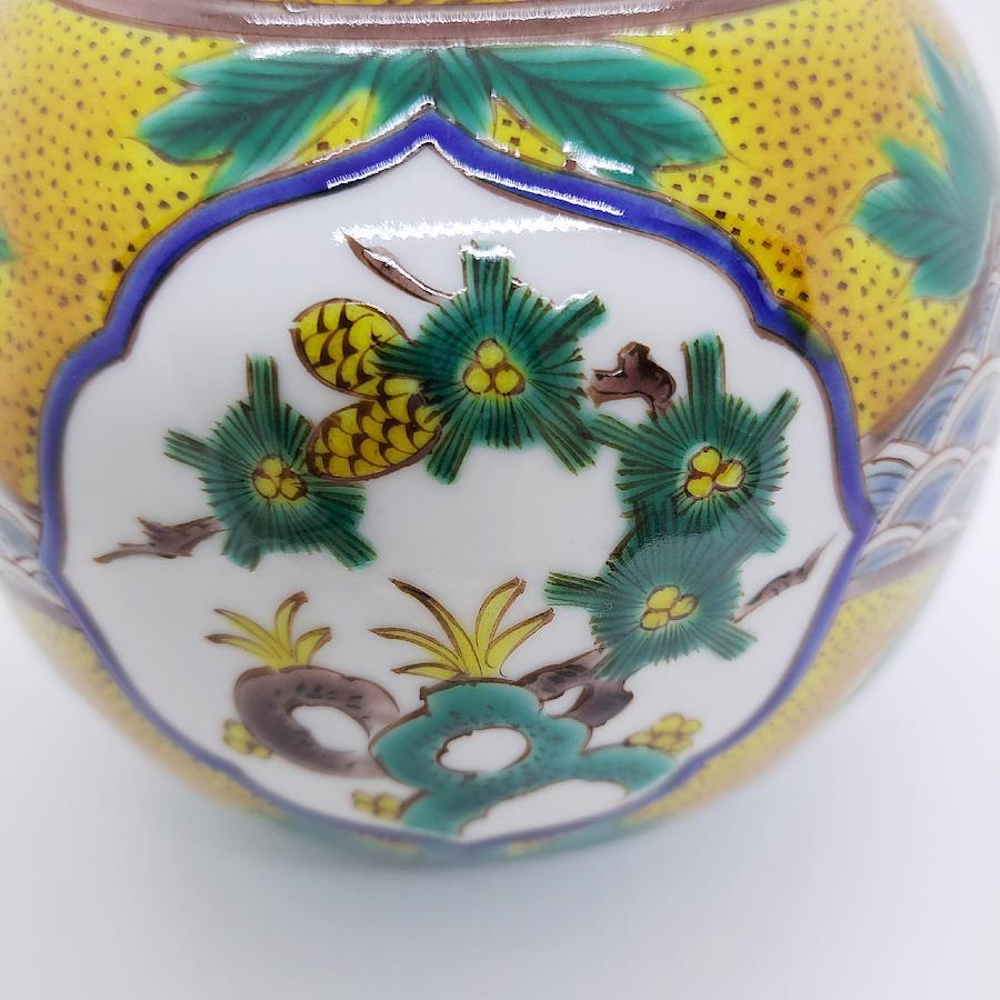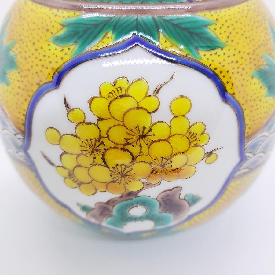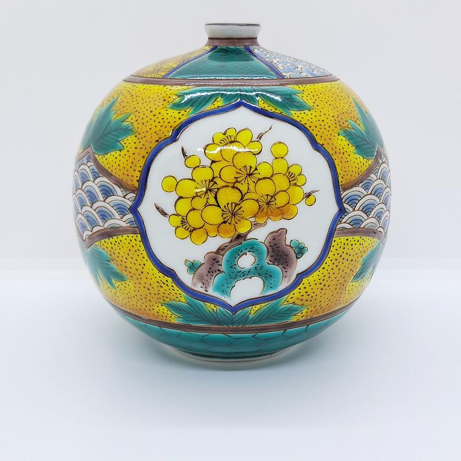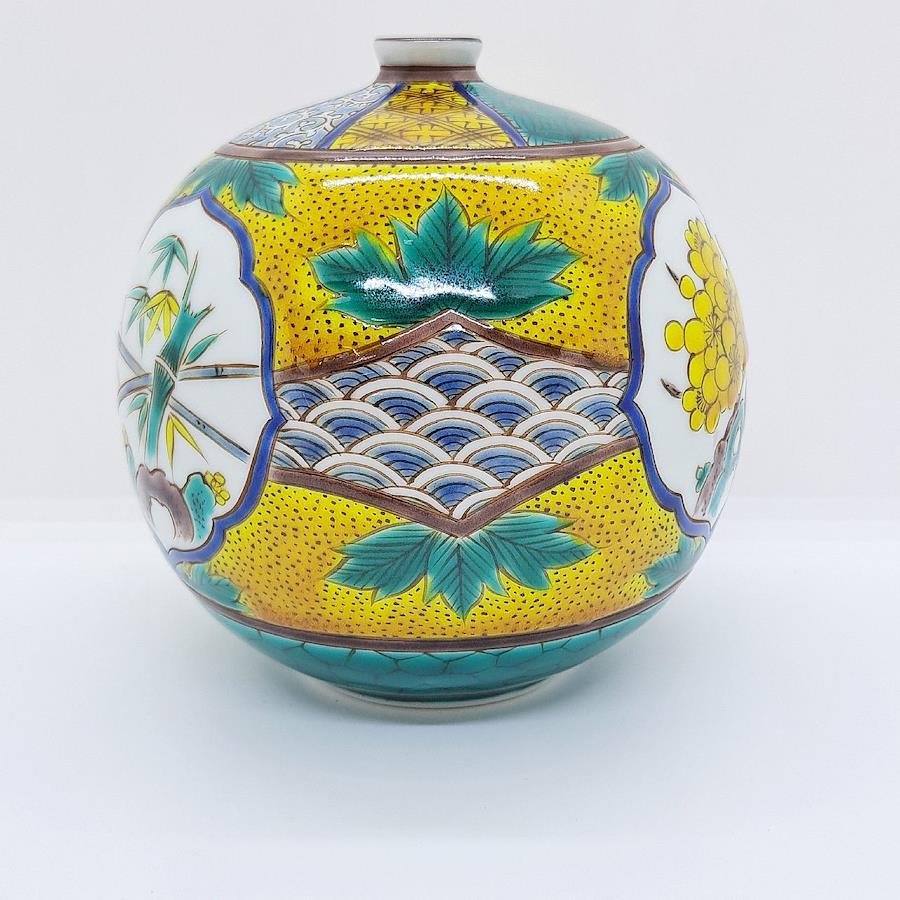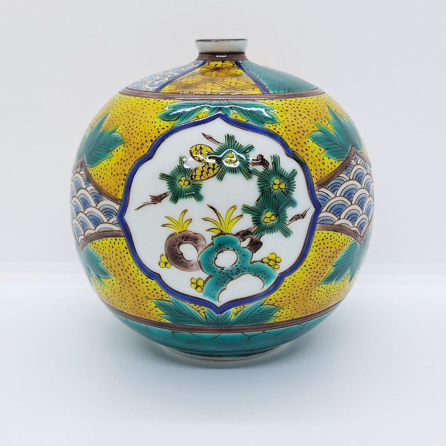 Kutani Ware 4-inch Vase: Pine, Bamboo, and Plum Blossoms in Yoshidaya Style. Crafted by Traditional Artisan Takayuki Hasegawa.四彩を使った伝統の吉田屋画風から、全く新しいスタイルの南国をイメージした九谷焼まで幅広い技術で魅せる伝統工芸士 糠川孝之氏による手描き品です。飾るだけで部屋全体の気を高めてくれます。※手作業品のため時間がかかります。受注生産になります。本体サイズ:約径12×高さ12cm