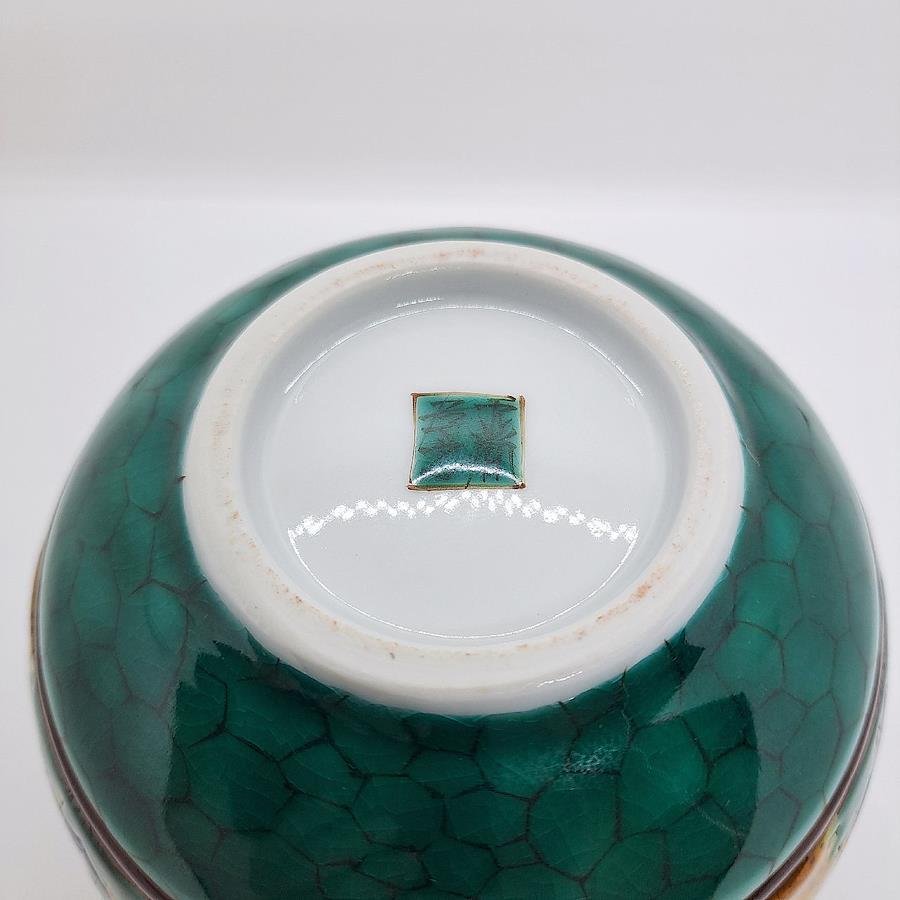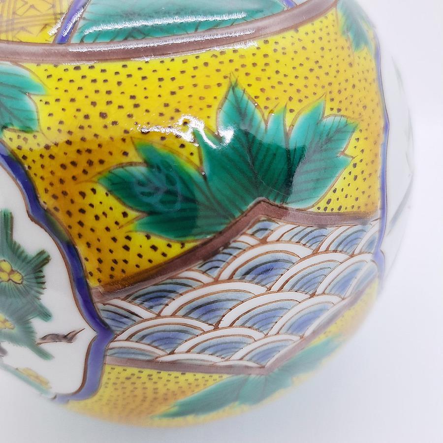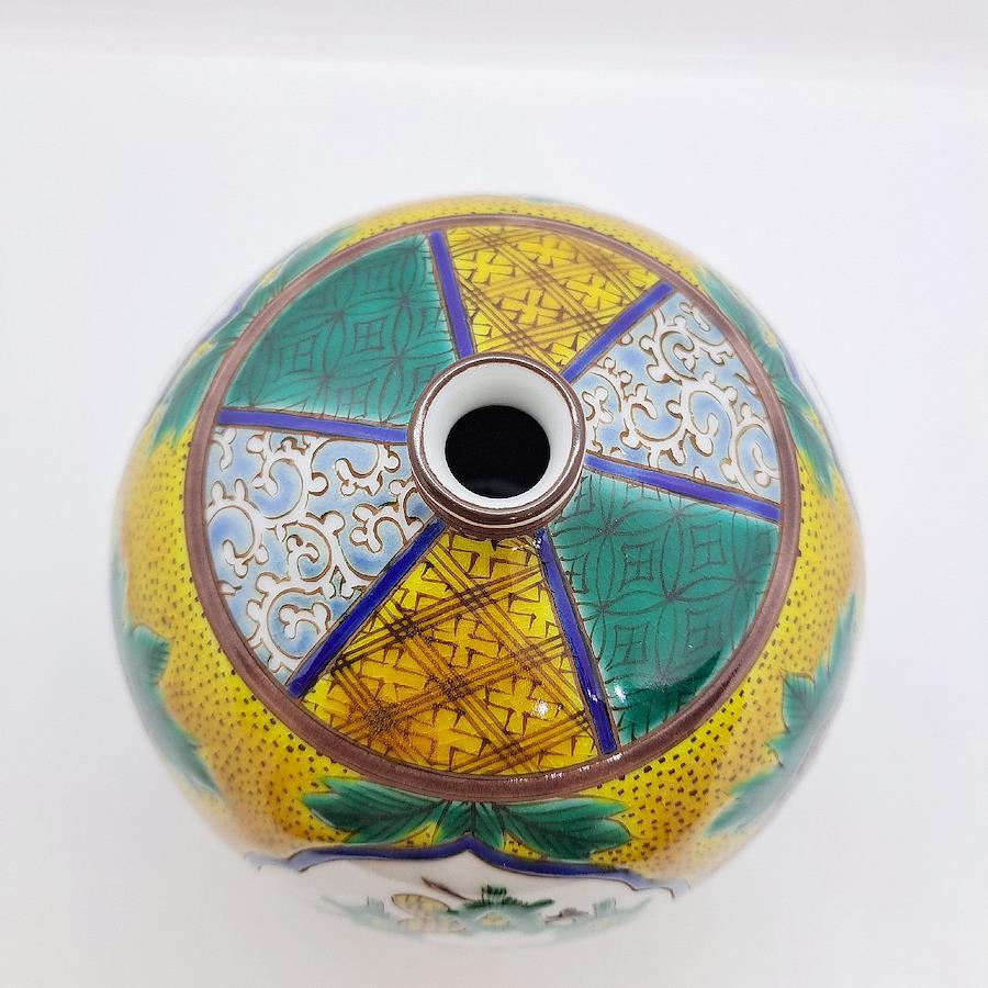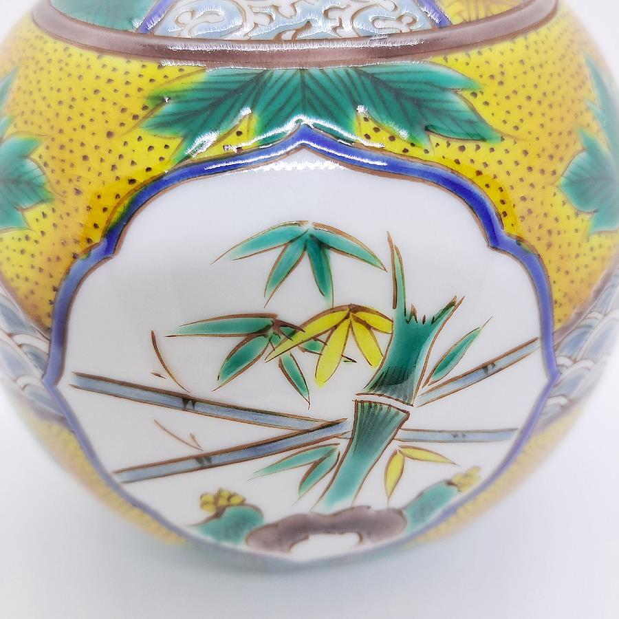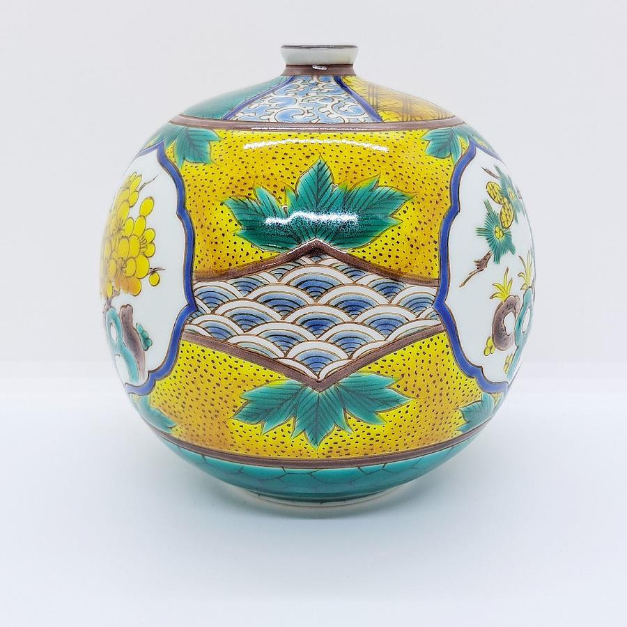 Kutani Ware 4-inch Vase: Pine, Bamboo, and Plum Blossoms in Yoshidaya Style. Crafted by Traditional Artisan Takayuki Hasegawa.四彩を使った伝統の吉田屋画風から、全く新しいスタイルの南国をイメージした九谷焼まで幅広い技術で魅せる伝統工芸士 糠川孝之氏による手描き品です。飾るだけで部屋全体の気を高めてくれます。※手作業品のため時間がかかります。受注生産になります。本体サイズ:約径12×高さ12cm
