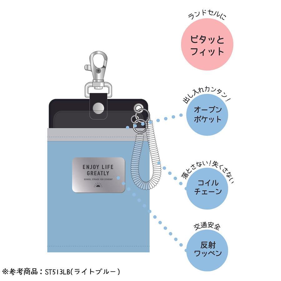 出し入れしやすいオープンポケット<br>ランドセルからの落下や紛失を防ぐコイルチェーン付き<br>雨の日や薄暗い下校時も安心な反射ワッペン付き