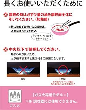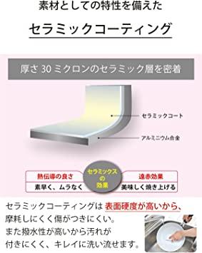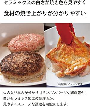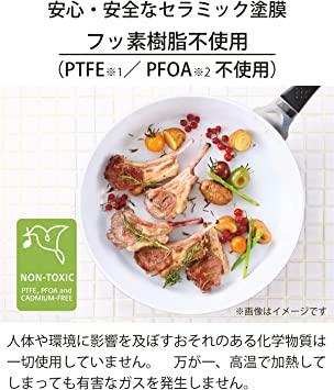 【セラミック加工】セラミックスは熱まわりが良く、フライパン内側全体からの遠赤外線効果で、中火でもしっかり火が通り、食材の芯まで熱が届く。肉料理をジューシーに、野菜炒めをシャキッと仕上げる。また、人体や環境に影響を及ぼす可能性のある化学物質 (PTFE ※1やPFOA ※2) は使用していない。※1 PTFE : ポリテトラフルオロエチレン=フッ素樹脂成分、※2 PFOA : ペルフルオロオクタン酸=フッ素樹脂製造過程で使われる化学物質【長くお使いいただくために】こびりつきを防ぐため、必ず油を使用する。火力はガス火で中火以下 (※)で、調理面の温度は上昇するので、160~180度を目安に調理していただくと焦げ付かずに使用できる。※中火 : 炎の先がフライパンの底に触れるか