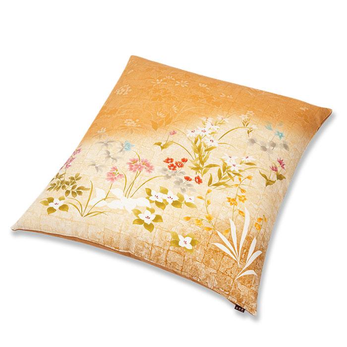 全体にあしらわれた「山野草」は着物の友禅染のような繊細さ。細やかな表現を得意とするデジタルプリントで染めました。箔模様の金屏風に描かれているかのように、サクラソウ、カタクリ、ミヤマヨメナ、キキョウなど山野に咲く可愛い花々が、暖かな橙色の陽射しの中で咲き競います。お部屋を上品に、ひときわ華やかに飾ってくれることと思います。生地は異なる太さの糸を使い平織りとなな子織りを組み合わせて織られたブッチャー生地で、格子のような織り模様があり、しっかり柔らかな手触りが心地よく織り糸の表情が感じられる素材です。裏側は金茶の無地で作りました。【カバーサイズ】 横65㎝×縦65㎝【生地素材】 綿(ブッチャー)100%この商品はカバー(ファスナー加工)のみです。中わたは別途ご購入ください。またカートの購入可能数より多い数をご希望の場合はご相談ください。