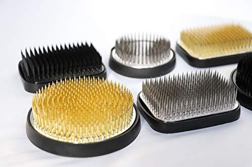 他にも角剣山や草花用剣山など、幅広い種類の剣山を取り扱っております。 生け花には欠かせない剣山です。 剣山専門の老舗メーカー石崎剣山製作所により製造された本格派の剣山で、完全日本製です。 鮮やかな輝きの真鍮針、硬く錆びにくいステンレス針、落ち着いた雰囲気と風格で人気の黒剣山等、幅広い色・サイズをご用意しております。 小丸(直径 61mm, 高さ 21mm, 重量 247g )、大丸(直径 80mm, 高さ 21mm, 重量 490g )、特大丸(直径 102mm, 高さ 25mm, 重量 843g ) 花器を傷つけないゴムリングが付いていますので、大変ご好評を頂いております。 器に選ばれ、花にも選ばれる、そんな名脇役になれる本物の剣山です。 春夏秋冬の草花を飾って、生活に彩りを加えましよう。