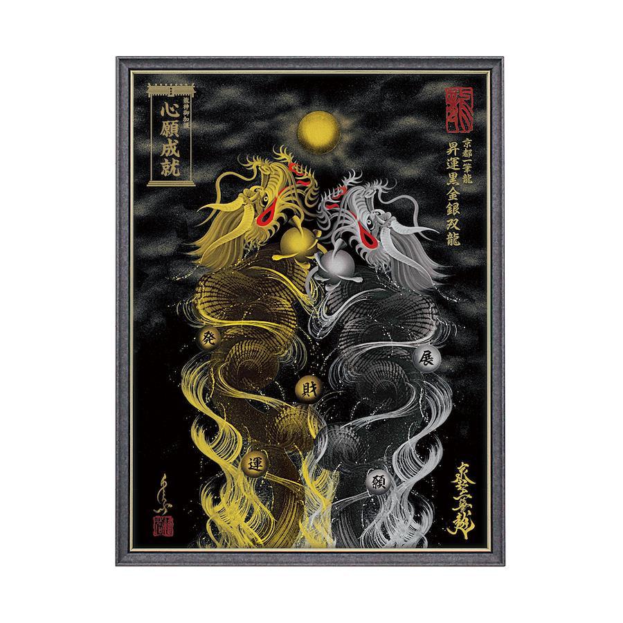 【商品の特徴】・京都一筆龍描画の種類/色彩は【26種】よりお選びいただけます<昇運龍14種(双龍5種/1体龍9種)> <守護龍10種(双龍2種/1体龍8種)> <縁結び龍2種(双龍2種)>・『京都一筆龍の御加護/御利益の象徴=胴体部分を一切途切れさせず一筆で描く動画』のQRコード印字ステッカー(2色/4サイズ)を同封お納めいたしております・描画に記載可能なお願い事は6種のご祈願内容より御選定いただけます心願成就/事業繁栄/金運上昇/健康祈願/家内安全/良縁成就・国内生産の高級額縁(デッサン額)を使用。額縁の色/機能は7種よりお選びいただけます。・龍の眼に光を宿し生気を吹き込む『龍の瞳(ラインストーン)』加工・京都一筆龍絵師手島啓輔署名、落款入り・御贈答のご利用も多く、懇切丁寧な包装
