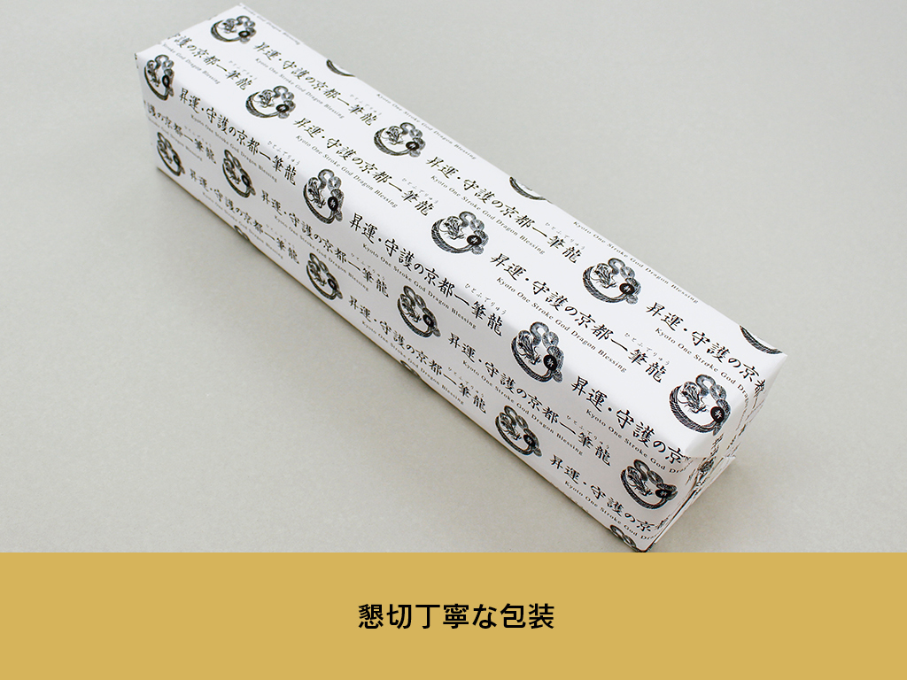 【一筆(ひとふで)龍とは】その名の通り胴体部分を一本の筆により一筆(ひとふで)で一切途切れさすことなく願い、祈り込めながら描くことで『発展・財運が途切れない』『良縁・成長が途切れず人を繋ぐ』『守護・安全が保たれ続ける』とされている龍。江戸時代(1603年~)から現在に至る約400年もの間、御加護、御利益が非常に強く龍神樣として崇め重宝され願い信じ伝え続けられています。『京都一筆龍の御加護/御利益の象徴=胴体部分を一切途切れさせず一筆で描く』