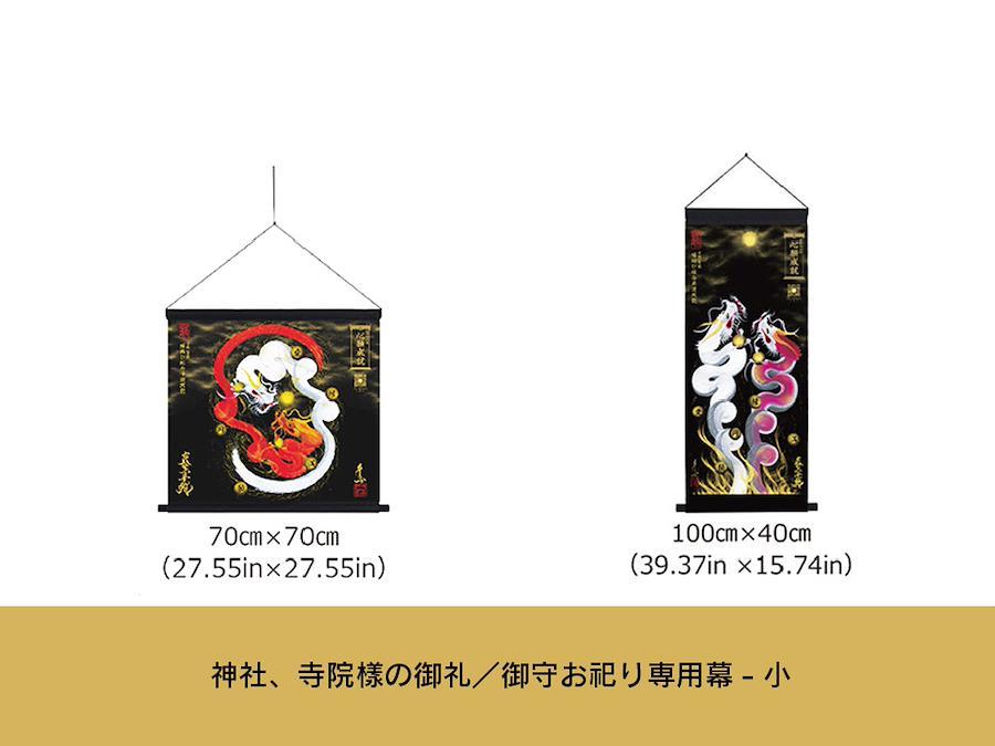 【商品の特徴】・京都一筆龍描画の種類/色彩は【26種】よりお選びいただけます<昇運龍14種(双龍5種/1体龍9種)> <守護龍10種(双龍2種/1体龍8種)> <縁結び龍2種(双龍2種)>・『京都一筆龍の御加護/御利益の象徴=胴体部分を一切途切れさせず一筆で描く動画』のQRコード印字ステッカー(2色/4サイズ)を同封お納めいたしております・描画に記載可能なお願い事は6種のご祈願内容より御選定いただけます心願成就/事業繁栄/金運上昇/健康祈願/家内安全/良縁成就・御札など添付のお祀り用マグネットを使用してお祀り(取り外し/位置変更可能)・発色が良く落ち着いた風合いの防炎スエード生地製(厚み約0.35~ ※官製郵便はがき約1.5枚程度/コピー用紙約4枚分程度)※ スエードは皮革・合成皮革ではなく専用布の名称となります。・吊り下げ用の上下軸棒付き(下部は軸先付き)※軸棒を外して飾られる場合でも、紐や止め具(画鋲、釘、ネジ等)をお使いいただけるハトメ穴付き(表面からは見えません)・丈夫で切れにくくシンプルな風合いの江戸打ち紐付き(黒/白2色)・龍の眼に光を宿し生気を吹き込む『龍の瞳(ラインストーン)』加工・京都一筆龍絵師手島啓輔署名、落款入り・御贈答のご利用も多く、懇切丁寧な包装