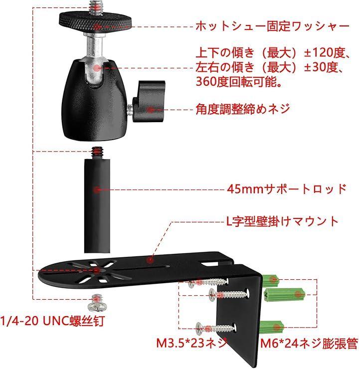 *製品名:L字型壁掛けマウント *材質:アルミニウム *サイズ:92x45x157mm *本体重量: 155g *耐荷重:5kg L型壁掛けブラケットを使用すると、1/4インチのネジ穴を持つプロジェクタやカメラを壁や天井(*荷重5 kg以下)に取り付けることができます。