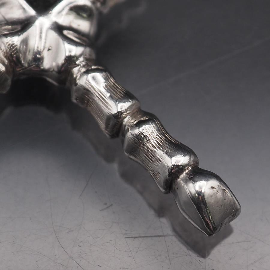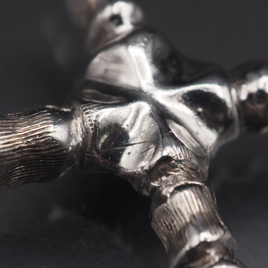 おそらく銀製かと思いますが、刻印が無いため断言できません。画像をたくさん掲載しておりますのでそちらでご確認とご判断をお願いいたします。