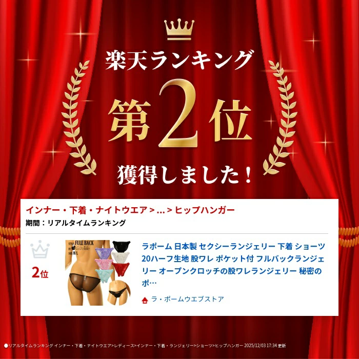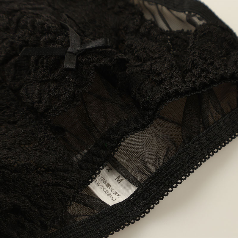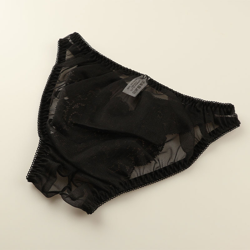 華やかで軽やかな質感を持ち、柔らかな触り心地と優美な透け感が魅力的でセクシーなシースルー素材の20ハーフ生地とストレッチレースを使用したフルバックショーツになります。クロッチ部は大胆なデザインのオープンクロッチになりフロントにはポケットが付いた遊び心のあるセクシーデザインのランジェリーになります。