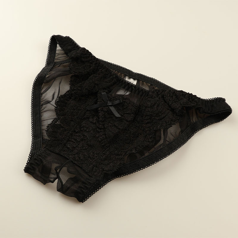 華やかで軽やかな質感を持ち、柔らかな触り心地と優美な透け感が魅力的でセクシーなシースルー素材の20ハーフ生地とストレッチレースを使用したフルバックショーツになります。クロッチ部は大胆なデザインのオープンクロッチになりフロントにはポケットが付いた遊び心のあるセクシーデザインのランジェリーになります。