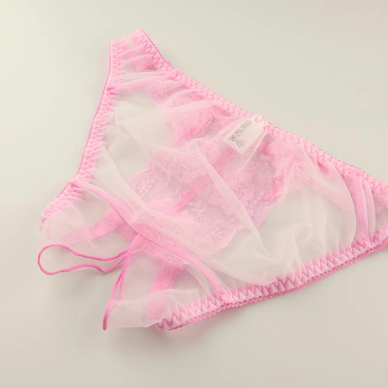 軽くてふんわりとした透け感がありシースルー素材が特徴の20ハーフ生地とチュールレースコンビのフルバックショーツになります。セクシーで大胆なデザインの股ワレランジェリー。