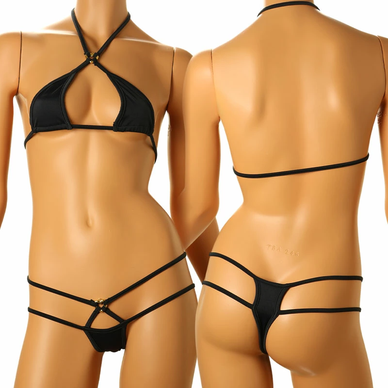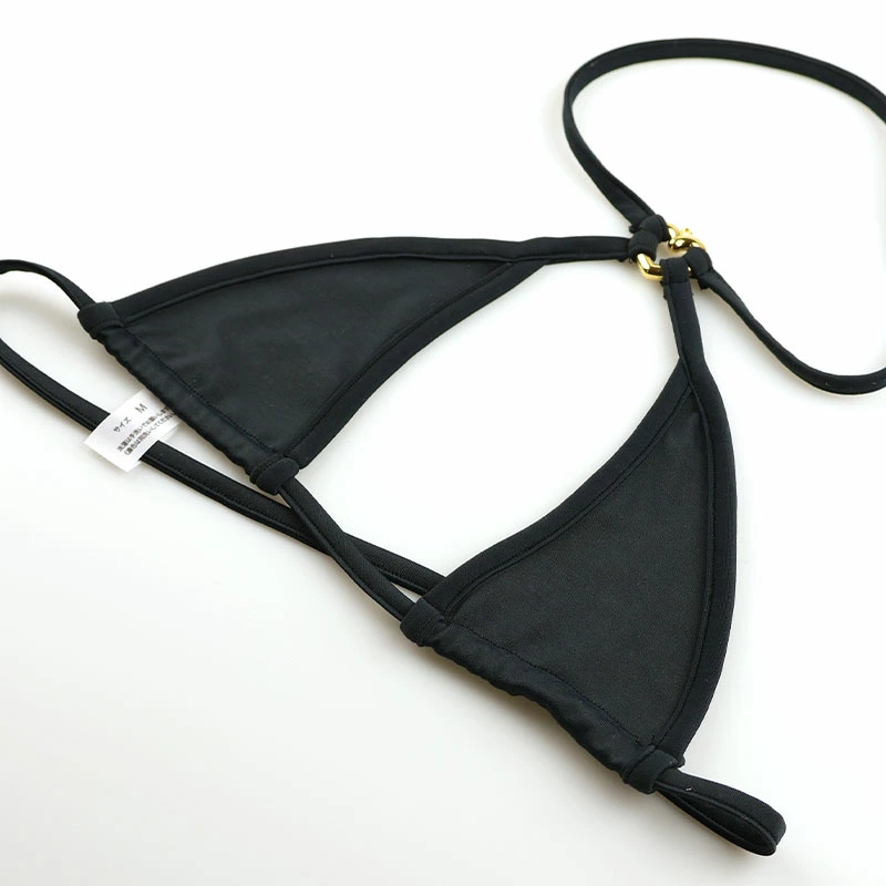発色が豊かで美しさを持ち、しっかりとしたハリ感と気持ち良い触り心地が魅力のE6000生地を使用した、ホルターネックタイプの三角ブラとTバックショーツのセット。フィットしながらも三角ブラはホルターネックタイプで、美しいバストラインを取りつつ、肩への負担を軽減するデザイン。ショーツは2本ループゴム仕様で、セクシーでミニマルな印象を与え、軽やかな履き心地を実現。