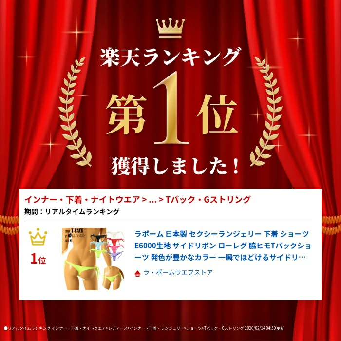 この生地は発色が豊かでハリがあり、触り心地が気持ちよく、さらに伸縮性が高いストレッチ素材のE6000生地を使用したTバックショーツになります。股上が少し浅目になったローレグでサイドリボンタイプの脇ヒモランジェリーになります。
