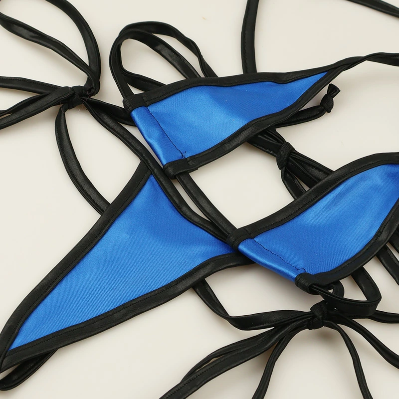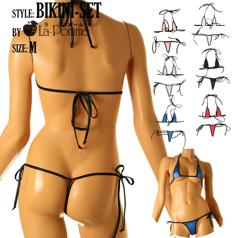 薄手で生地の表面に特殊な加工をし表面は光沢があり滑らかでヌメリ感のある伸縮性に優れたのが特徴のK2S生地を使用した三角ビキニセットになります。全カラーブラックパイピング仕様で生地の面積がとても小さいマイクロビキニになります。